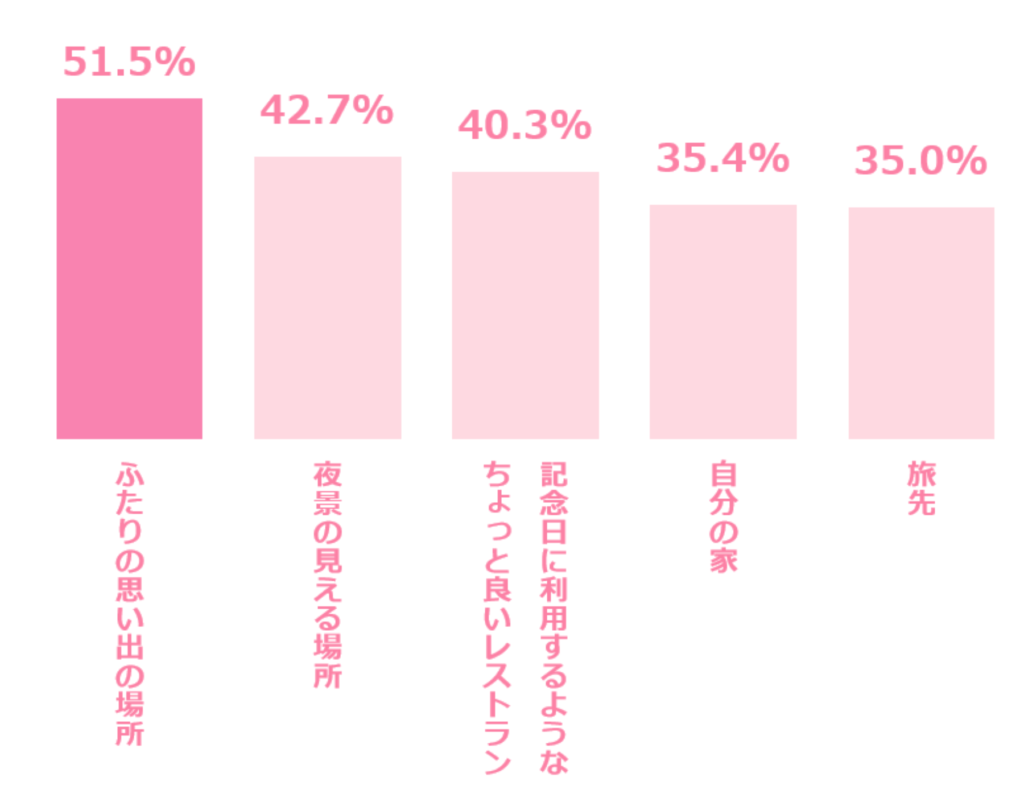 ゼクシィが2023年に行った「プロポーズの場所として「嬉しい」と思う場所は?」という調査では、第1位「ふたりの思い出の場所」、第2位は「夜景の見える場所」、第3位は「記念日に利用するようなちょっと良いレストラン」という結果となりました。やはり半数以上の女性が思い出に残るような特別な場所でプロポーズをされることに憧れていることが分かりますね。