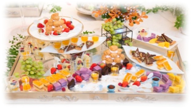 コースの結びとして締めくくられるデセールは フランス語でお皿や料理を片付けるという意味があり メインの料理を下げた後にデザートとして提供されます。 味だけでなく見た目も華やかで女性にも男性にもお楽しみいただけるお時間です。 デセールのタイミングでお二人の用意されたウェディングケーキも振る舞われます。 またプレートに分けられたデセールではなくお好きな物を選んで楽しめる デザートビュッフェも人気があります。