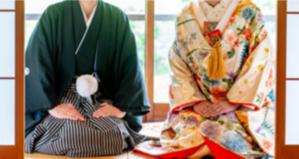 新郎衣装としては「黒の五つ紋付き羽織袴」が最も格式高いとされており、神前式や仏前式、和装人前式などで正装として選ばれています。付き袴も人気を集めており、伝統を守りながらもよりスタイリッシュで柔らかな雰囲気を演出できるのが魅力です。