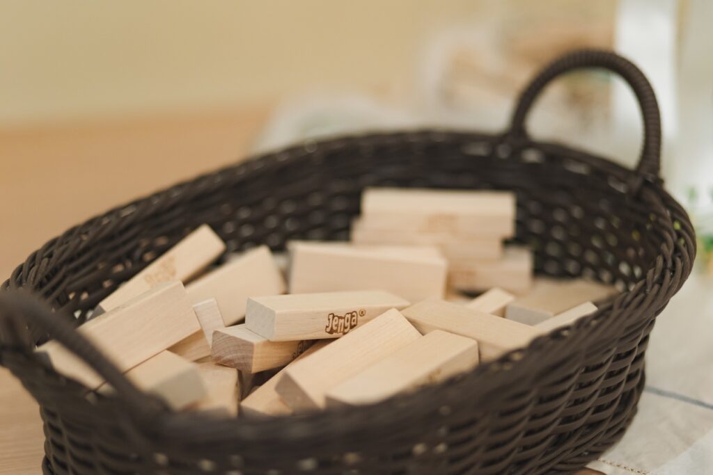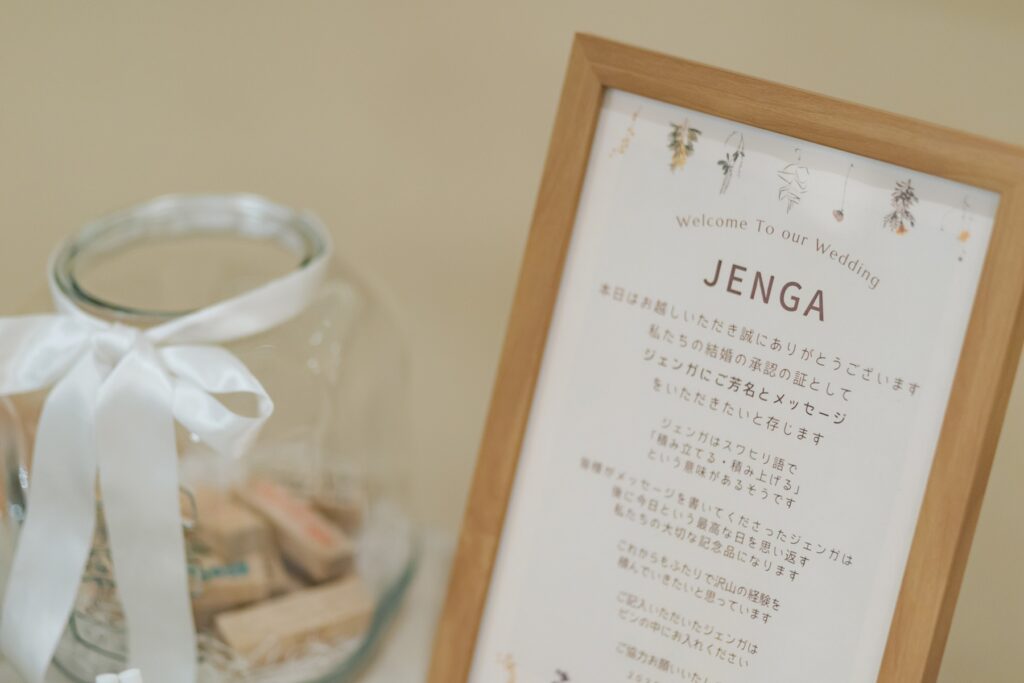 結婚証明書には、ゲストがメッセージを書いたジェンガをビンに入れ、最後におふたりが自分たちのジェンガを加えて蓋を閉じて完成。