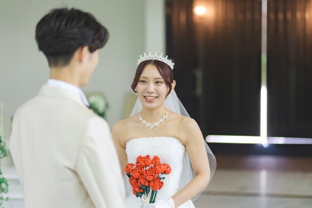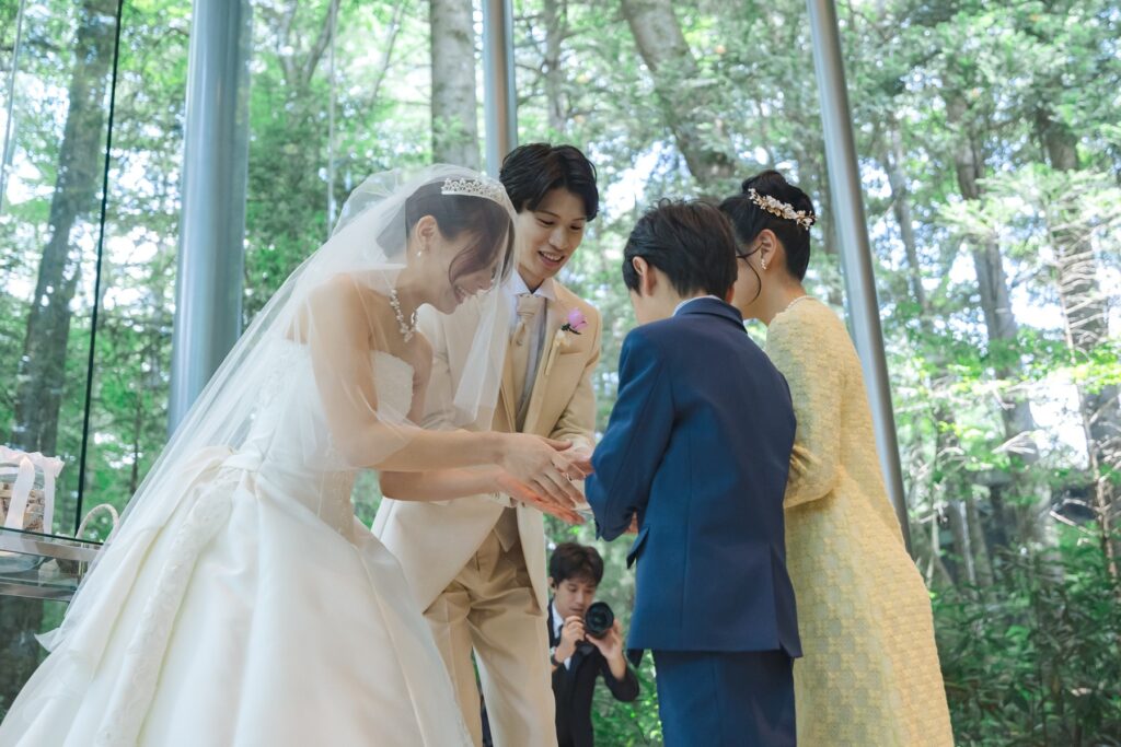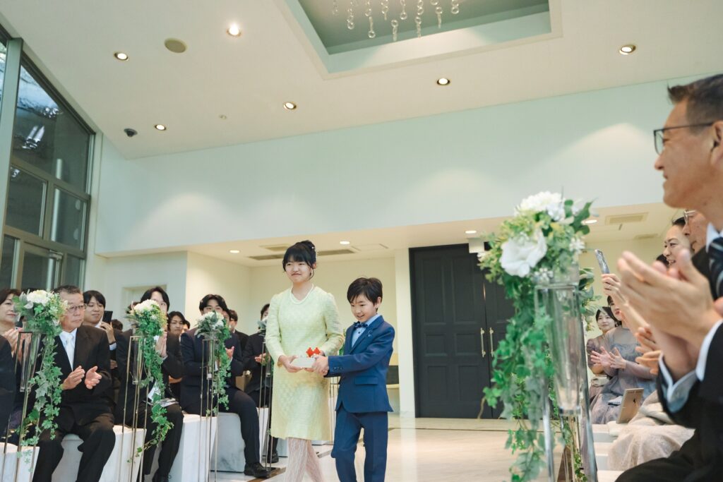 リングガール&ボーイが登場し、緊張しながらも可愛らしく指輪を届けると、会場には自然と笑顔があふれます。