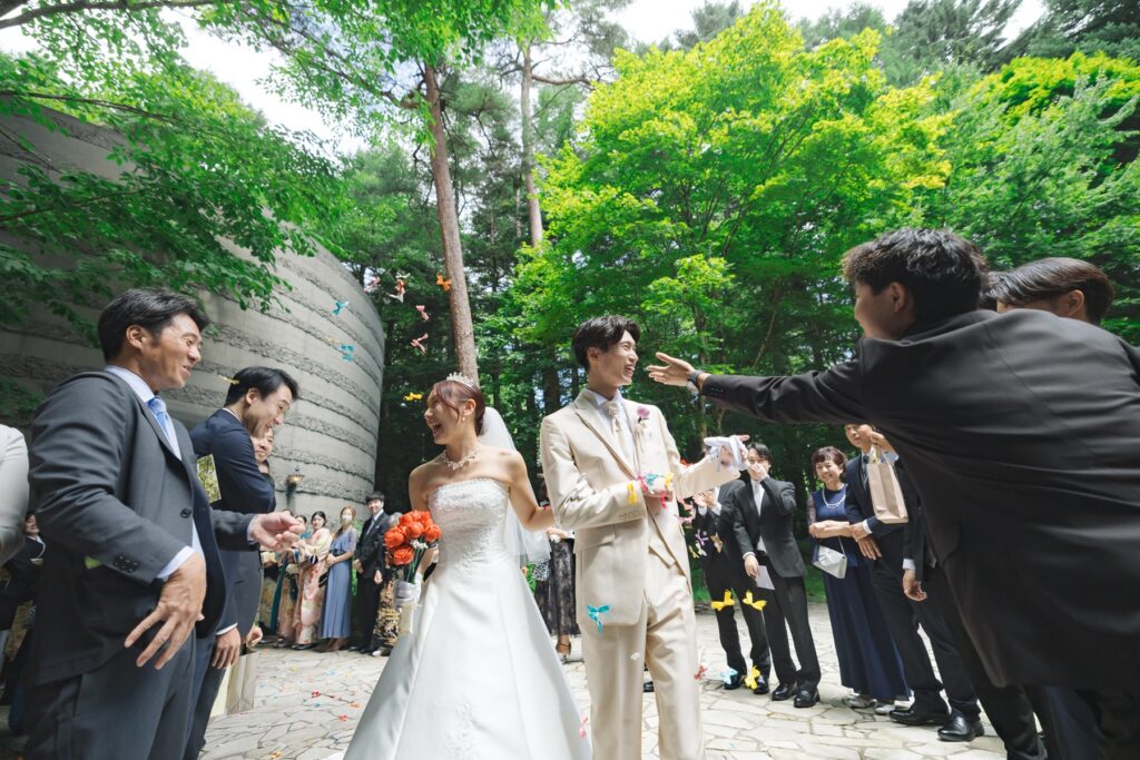 挙式のあとは、リボンシャワーの華やかな祝福を浴びながらの退場シーン。