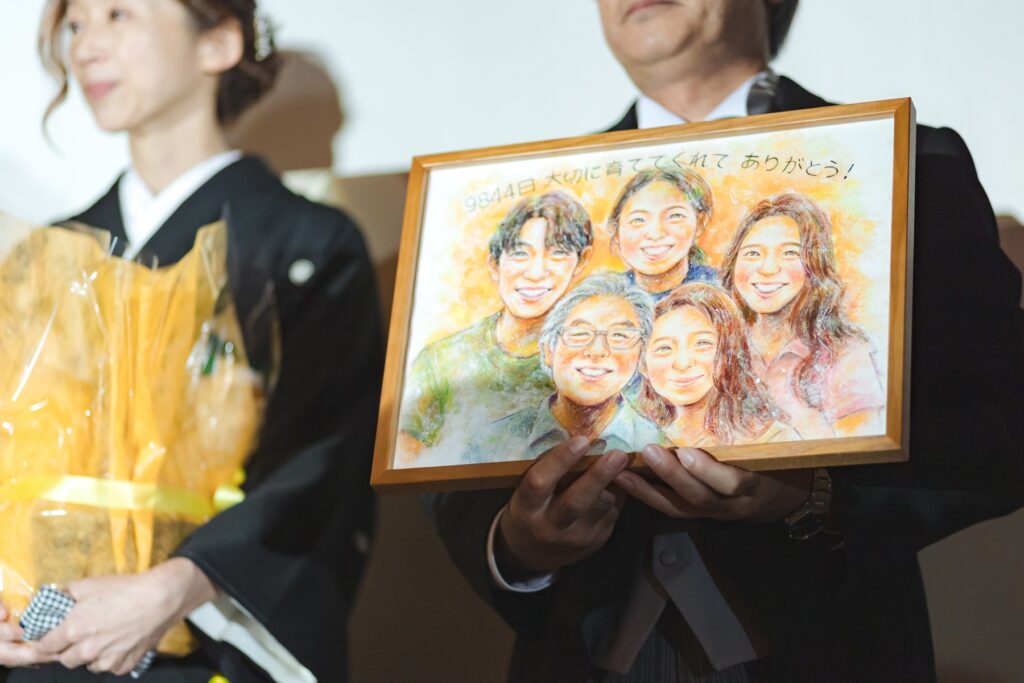 おふたりが選ばれたのは、美しく咲き続ける「バラの鉢」と、ご家族の笑顔を描いた「似顔絵」。