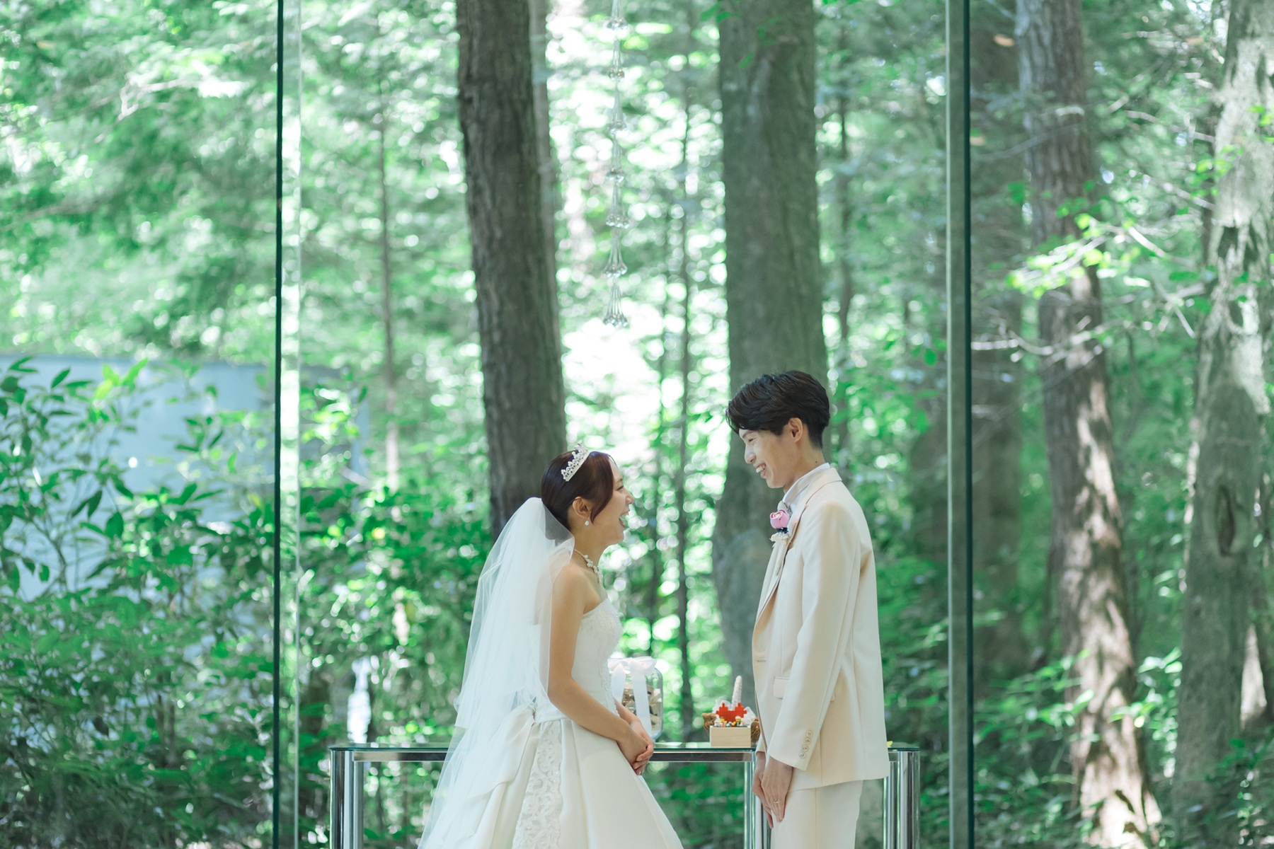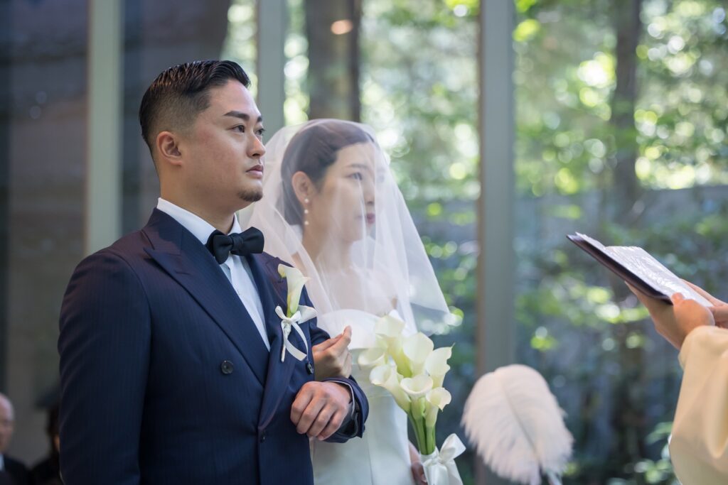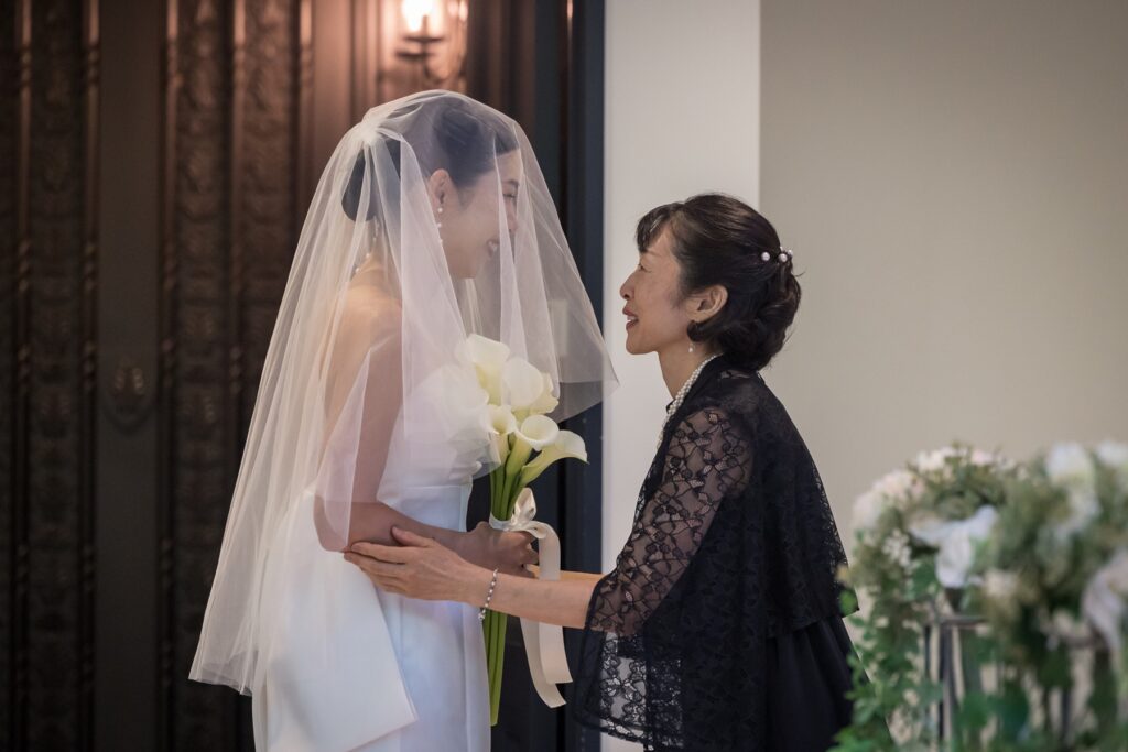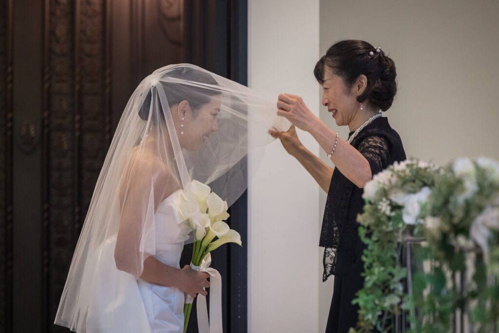 花嫁様のベールダウンでは、これまでの感謝を伝える親御様の思いが伝わり、涙と笑顔が交錯する温かなひとときとなりました。誓いの言葉に込められたおふたりの想いが、家族全員の心に深く刻まれる挙式でした。
