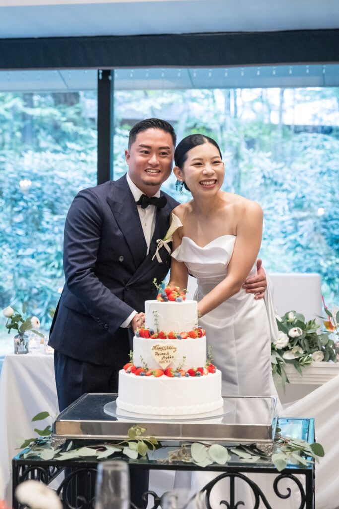華やかなケーキ入刀では、ふたりの楽しそうな表情が印象的。