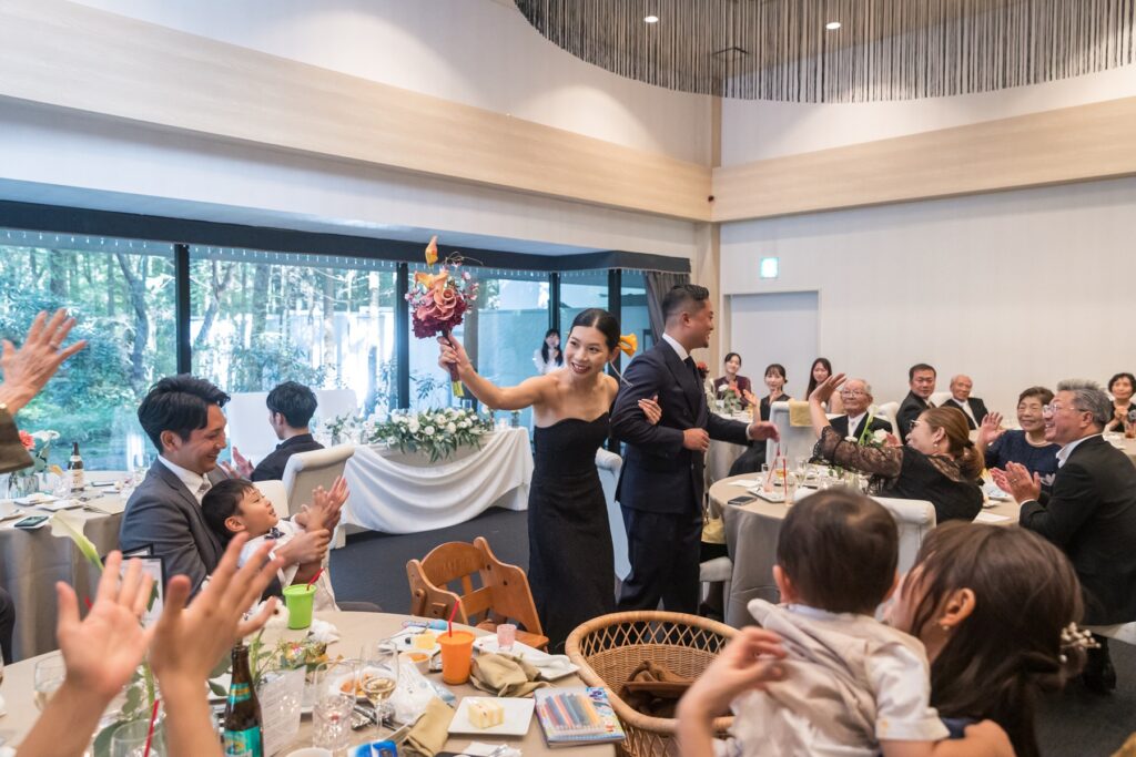 リラックスした笑顔や楽しい表情が写真に残り、ゲストとの距離もぐっと近づきます。開放的な空間で、アットホームな結婚式の温かさを存分に感じられる時間となりました。