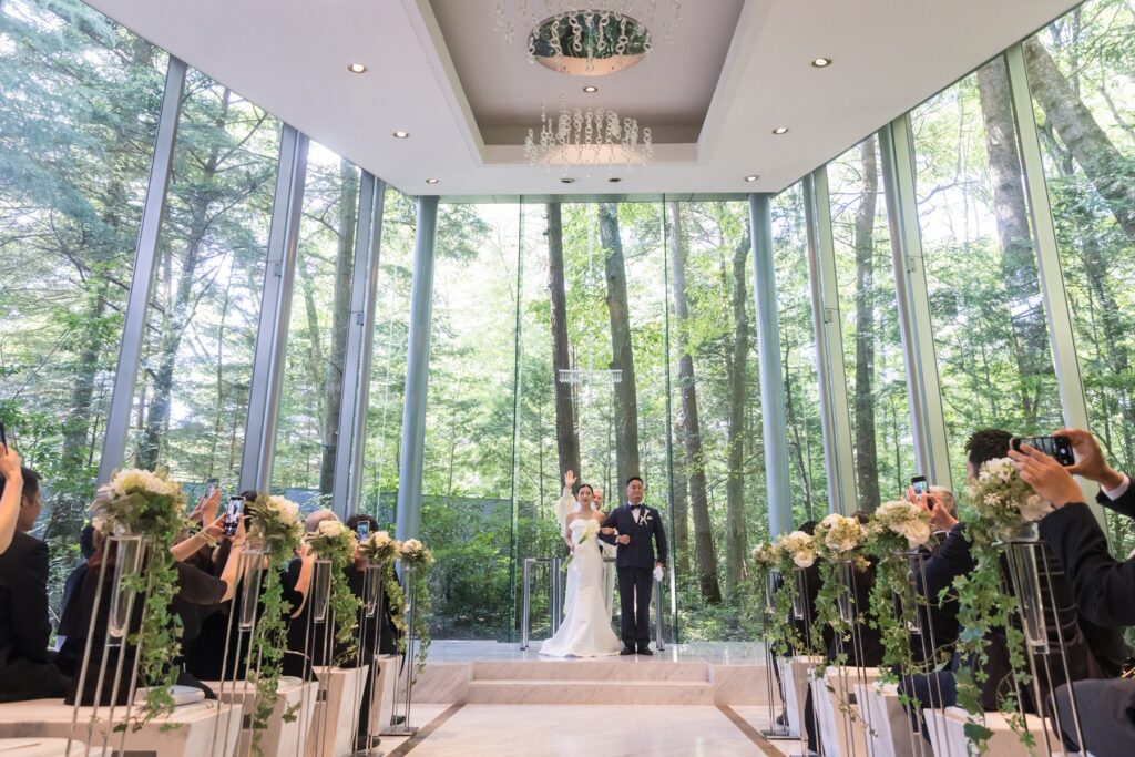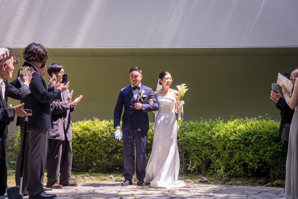 ゲスト一人ひとりに手を振りながら笑顔で退場するおふたりに、感謝と祝福の気持ちがあふれます。温かく笑顔に包まれた幸せな一日が、ここでやさしく幕を閉じました。