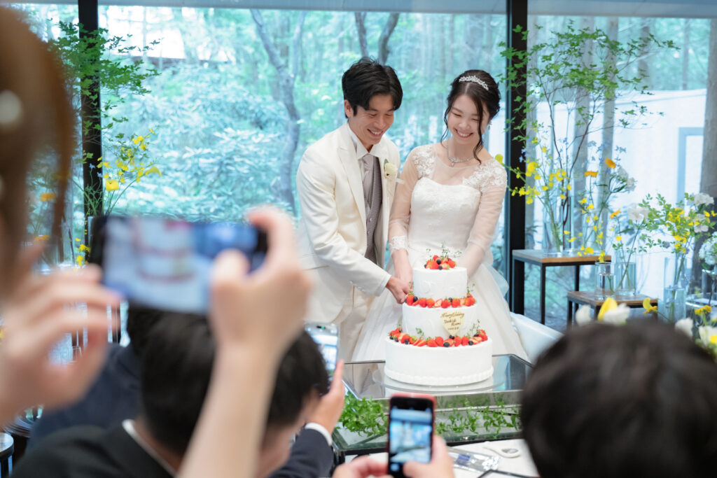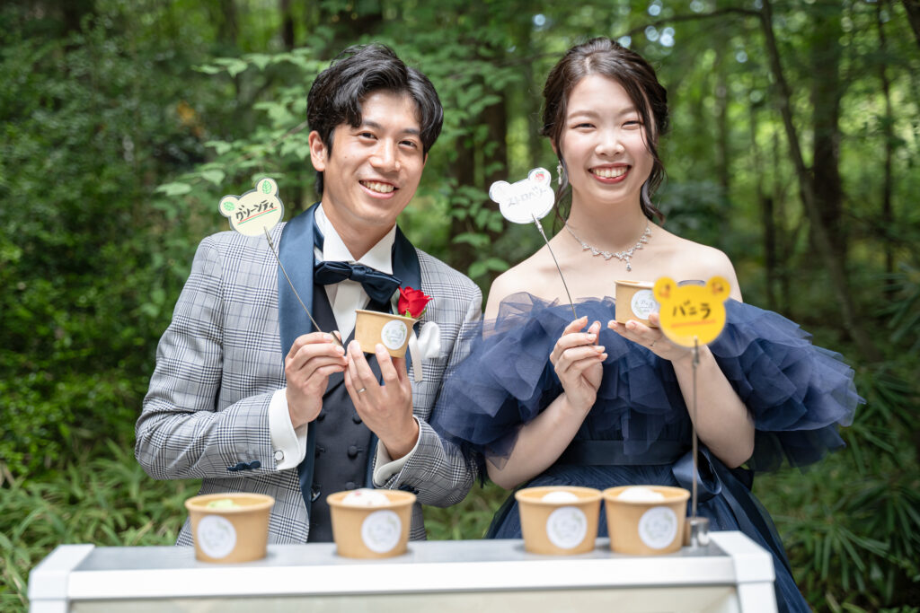 デザートタイムには、青空と新緑が広がるガーデンでハーゲンダッツビュッフェを実施。好みのフレーバーにトッピングを添えて楽しめる特別感が、ゲストの皆様に大好評でした。夏の軽井沢らしい爽やかな時間の中で、おふたりが大切にされた“楽しんでほしい”という想いが自然と伝わり、笑顔と会話が弾む心地よいおもてなしのひとときとなりました。