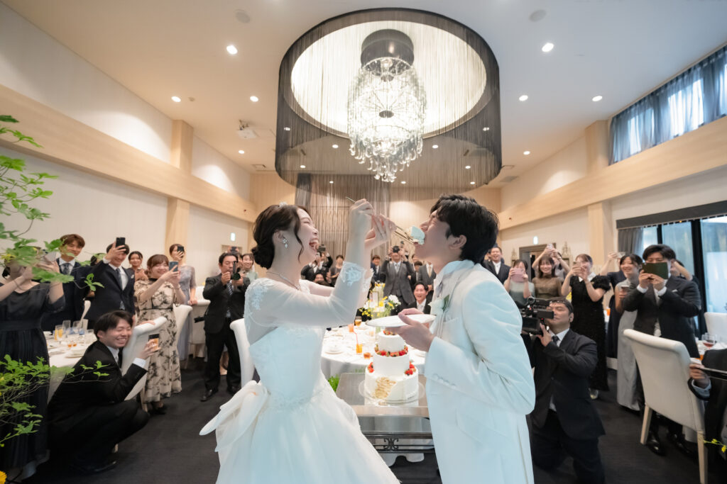 披露宴の盛り上がりを一気につくり出したのは、ゲストの視線が一斉に集まるケーキ入刀の瞬間。ナイフが入った途端、会場には温かな拍手と歓声が響きました。続くファーストバイトでは、おふたりの笑顔と掛け合いにゲスト皆様からも笑い声が溢れ、会場全体が幸せな空気に包まれました。思い出に残る、華やかで心温まるワンシーンです。