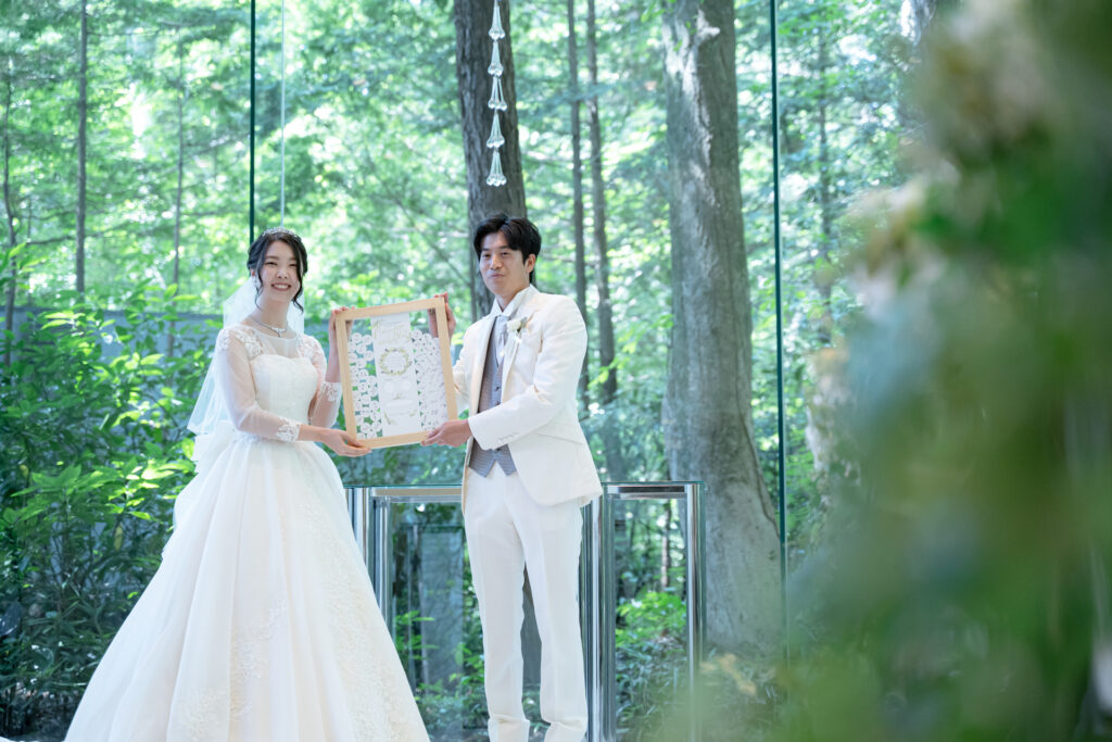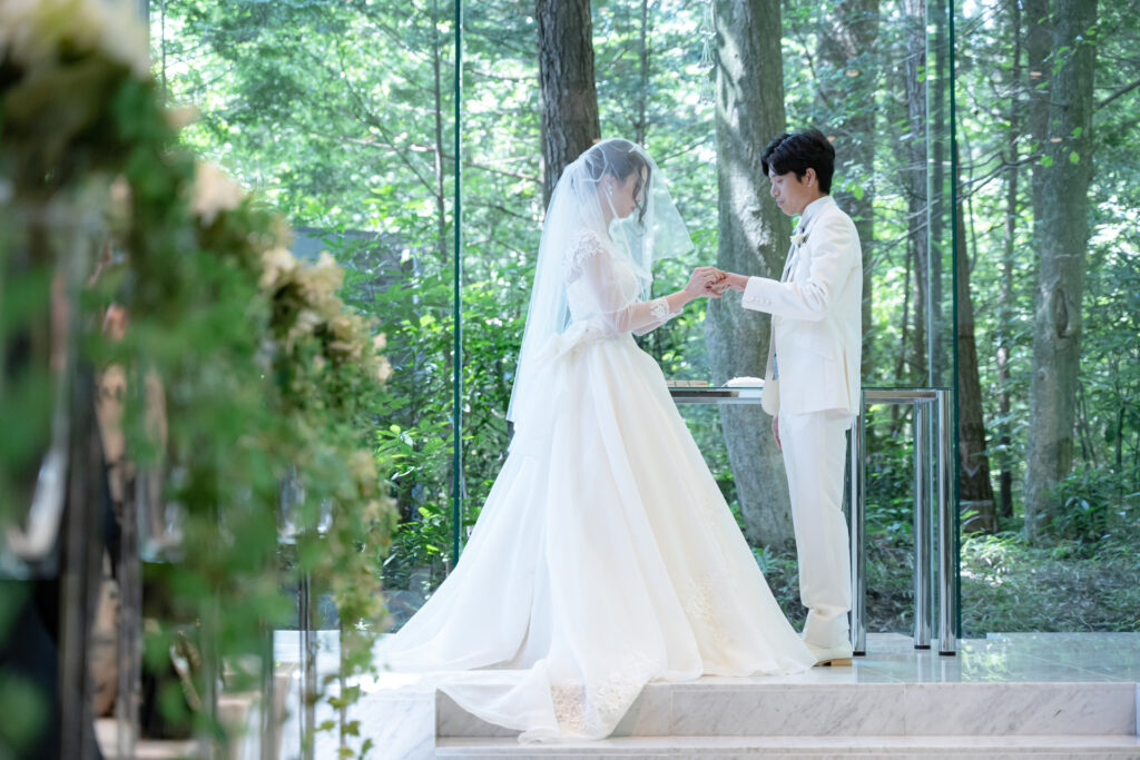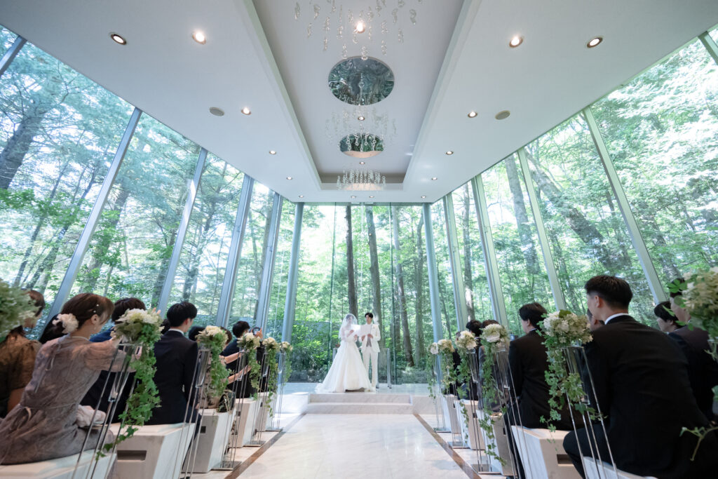 ガラス張りのチャペルにやわらかな光が差し込み、8月の明るい季節を感じる爽やかな空気に包まれた挙式。人前式ならではのあたたかさが漂い、ご家族・ご友人・職場の皆様が優しい眼差しでおふたりを見守ります。感謝の気持ちを込めた誓いの言葉は、笑顔と涙が混ざり合うように会場へ広がり、心に残る感動のひとときとなりました。