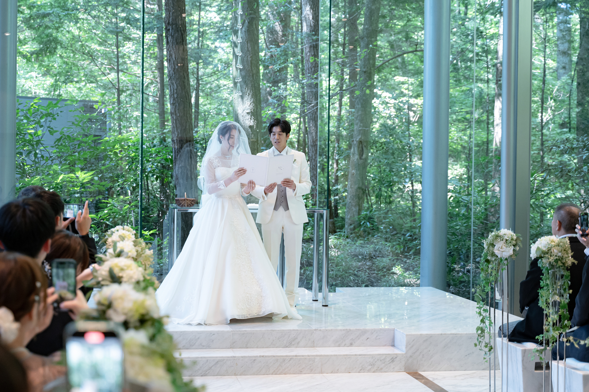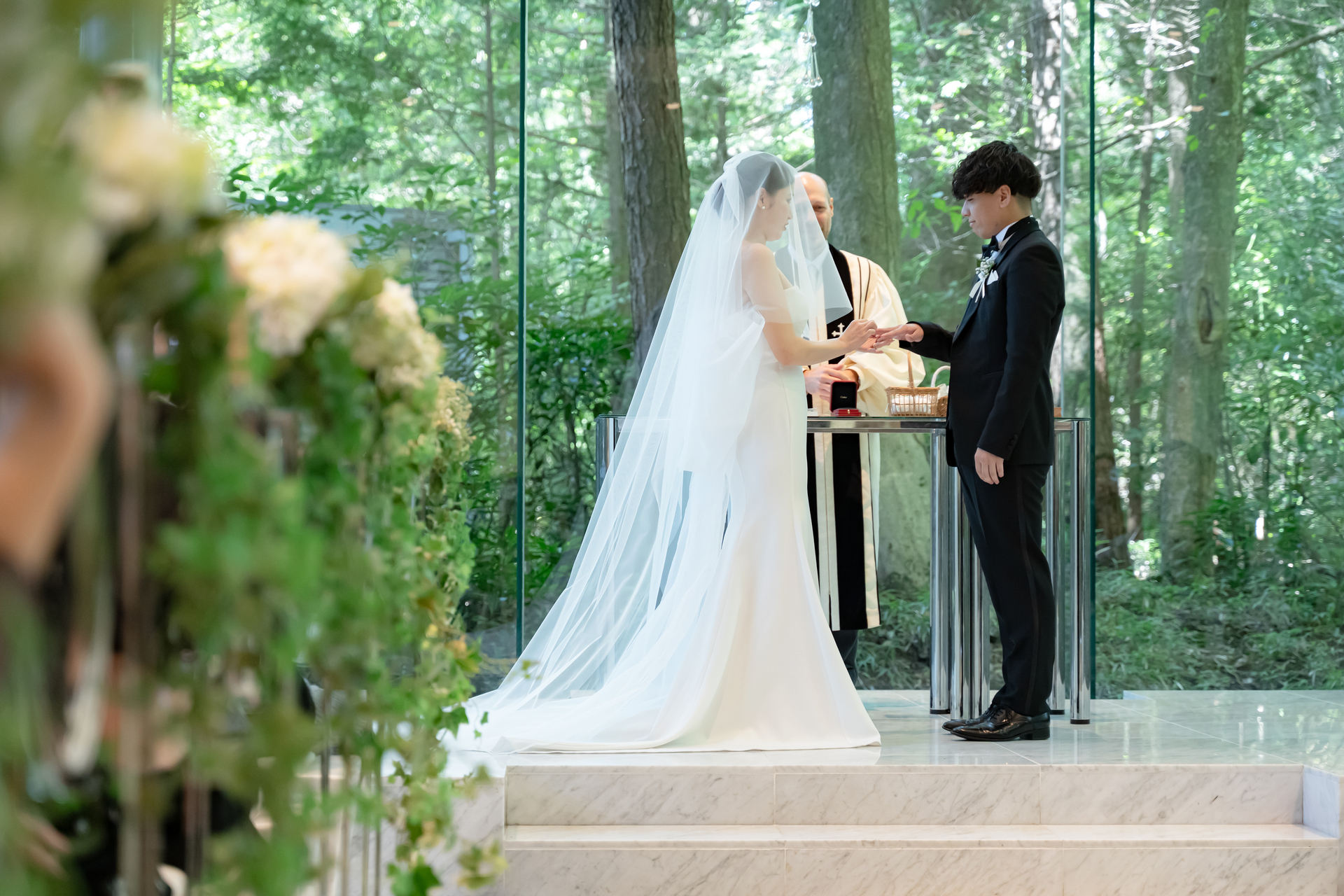 ガラス張りのチャペルにやわらかな光が差し込み、8月の明るい季節を感じる爽やかな空気に包まれた挙式。人前式ならではのあたたかさが漂い、ご家族・ご友人・職場の皆様が優しい眼差しでおふたりを見守ります。感謝の気持ちを込めた誓いの言葉は、笑顔と涙が混ざり合うように会場へ広がり、心に残る感動のひとときとなりました。