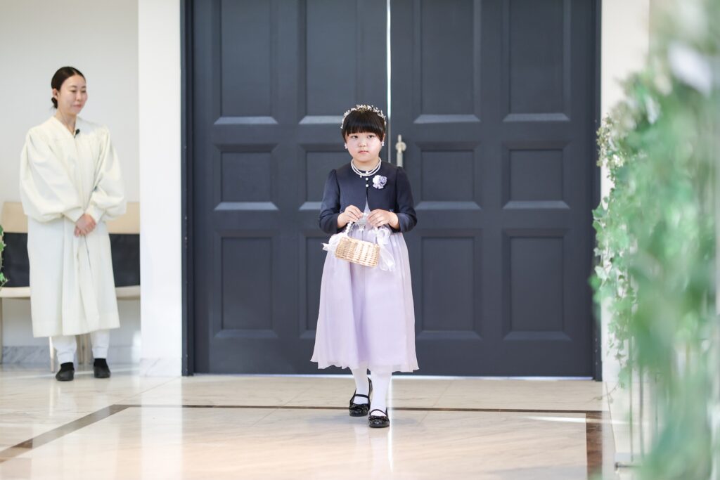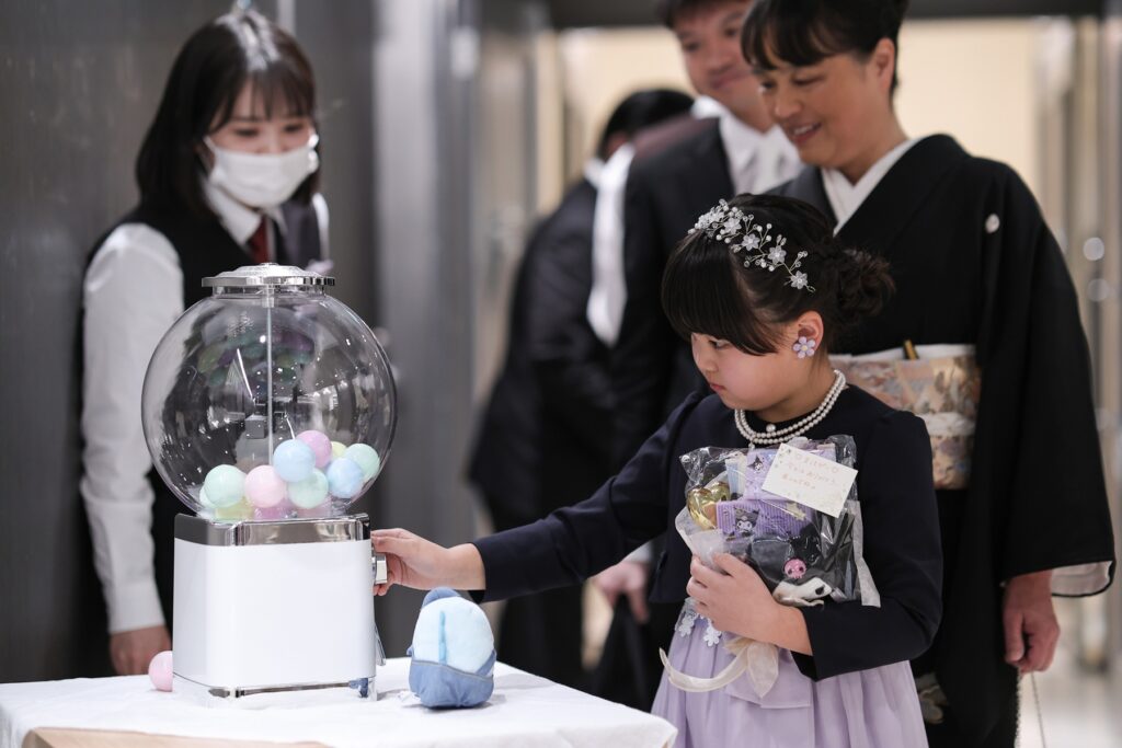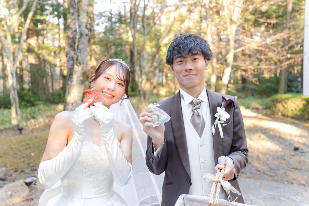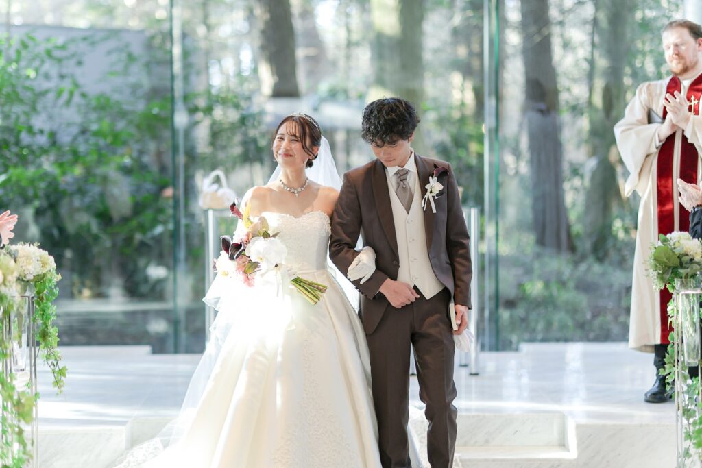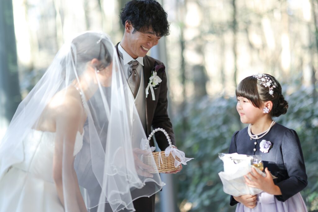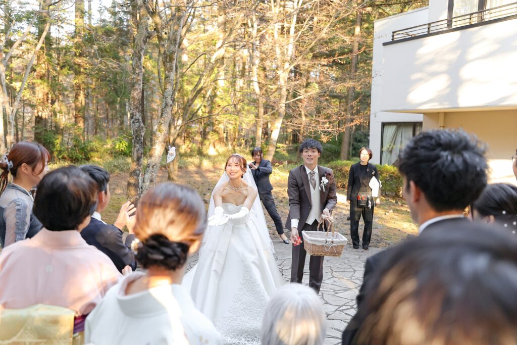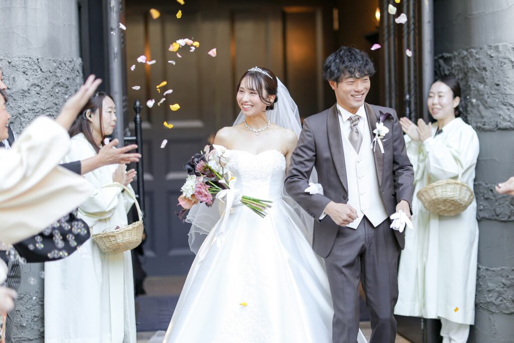 挙式後は、ガラス張りのチャペル前でフラワーシャワー。色とりどりの花びらに包まれながら、たくさんの祝福を受けられました。さらに、おふたりからの幸せのおすそ分けとしてお菓子まきを実施。歓声が響き渡り、世代を問わずお楽しみいただける、笑顔あふれるひとときとなりました。
