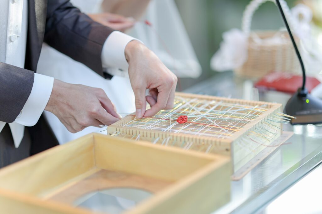 リングガールの愛らしい登場に、会場は一瞬で和やかな空気に包まれた挙式。おふたりが選ばれたのは、水引を用いたゲスト参加型の結婚証明書です。ひとつひとつ結ばれていく水引には、ご縁や絆を大切にしたいという想いが込められています。大切な皆様とともに完成させた証明書は、まさに「結絆」を象徴するかけがえのない宝物となりました。