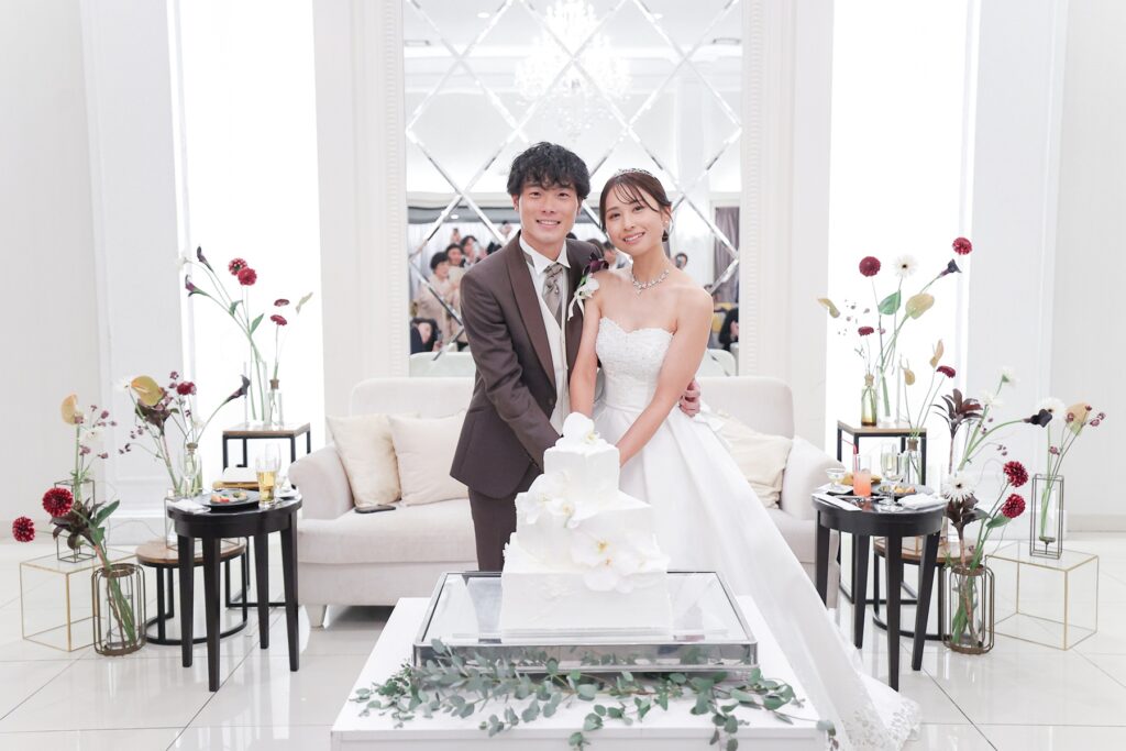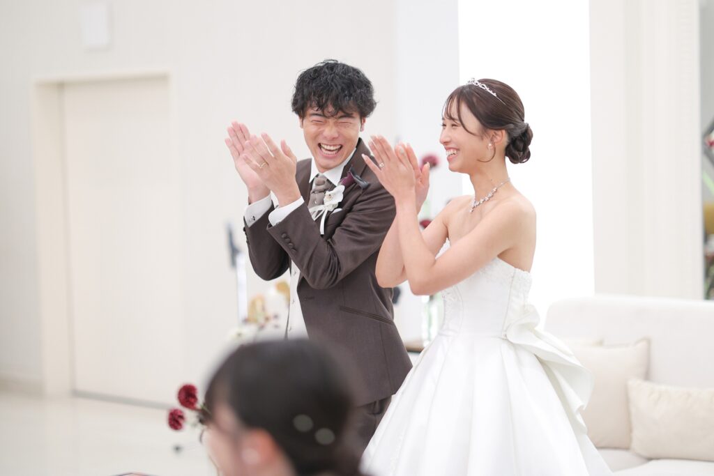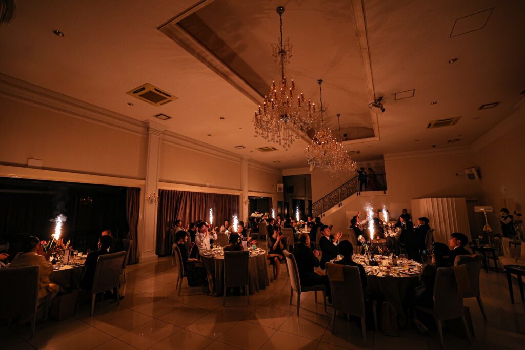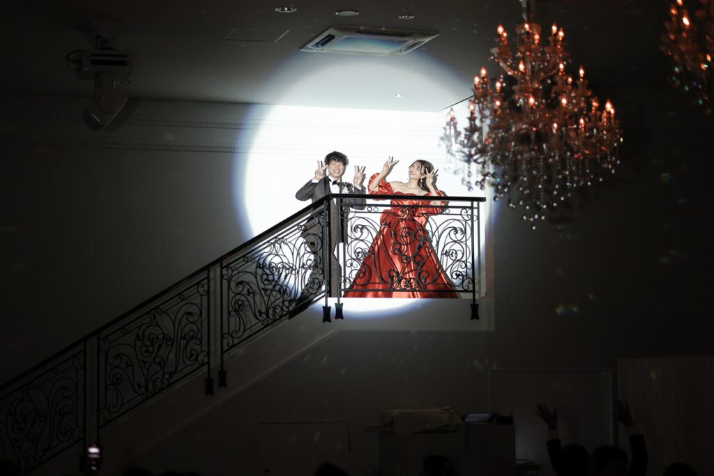 お色直し後は、階段から踊りながらのサプライズ登場。軽快な音楽とともに会場の視線を集め、一気にパーティーは最高潮へ。クライマックスには一斉点火の演出も行われ、きらめく光に包まれる幻想的な空間に。ゲストと心をひとつにした、記憶に残る華やかな再入場となりました。
