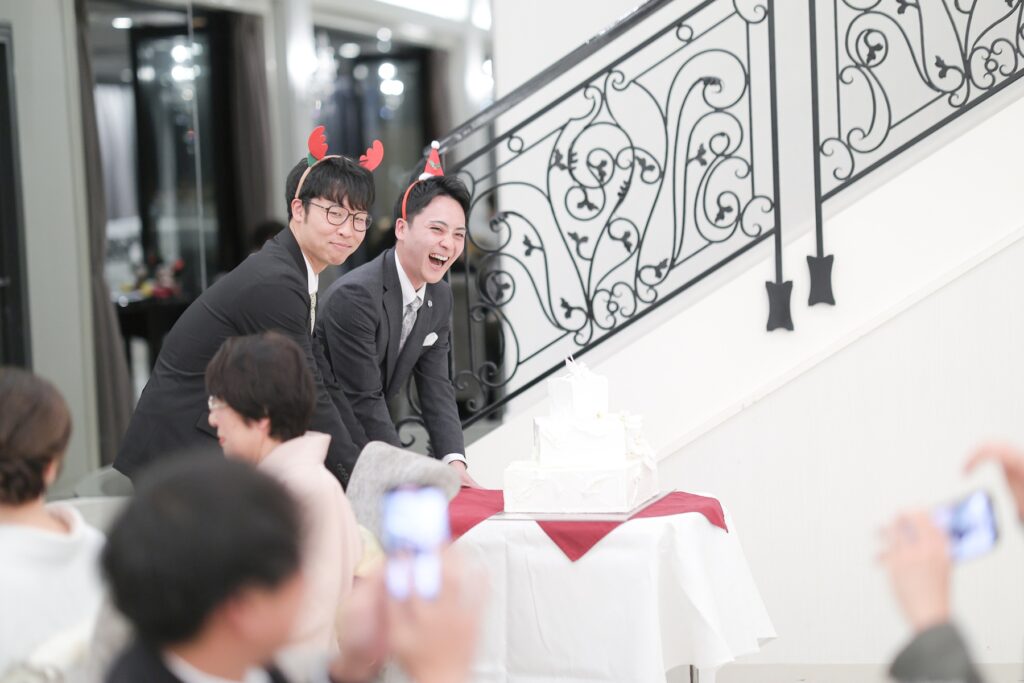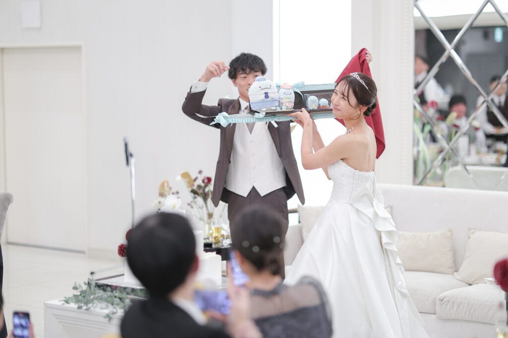 ケーキはゲスト代表のおふたりが心を込めてお届け。会場の温かな拍手に包まれながらご入刀となりました。さらに、両家親御様による“お手本バイト”では、長年連れ添われたご夫婦ならではの息の合ったご様子に、会場は大きな拍手と笑顔に包まれます。新婦様から新郎様へのファーストバイトでは、おふたりの大好きなキャラクターをモチーフにしたオリジナルスプーンが登場。遊び心あふれる演出に、会場もより一層盛り上がりました。