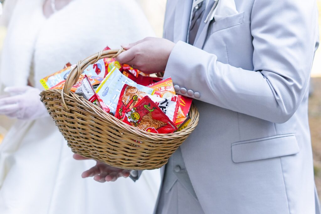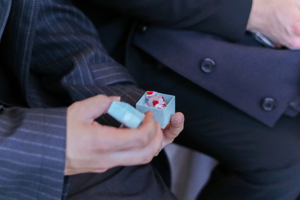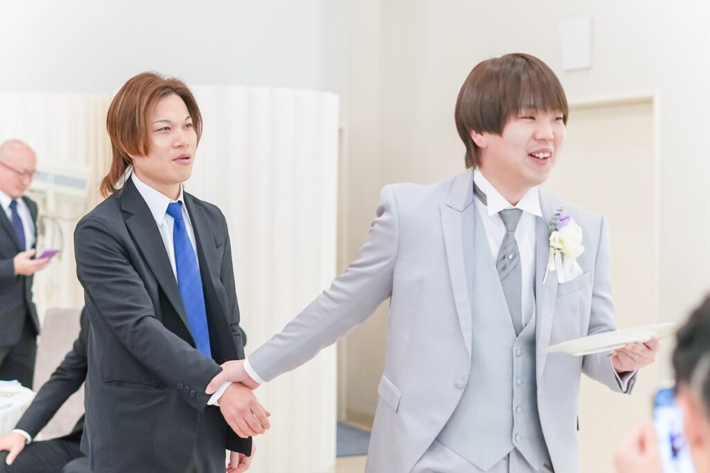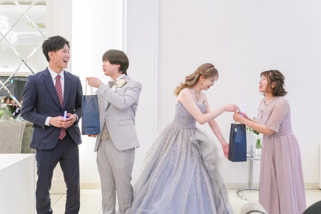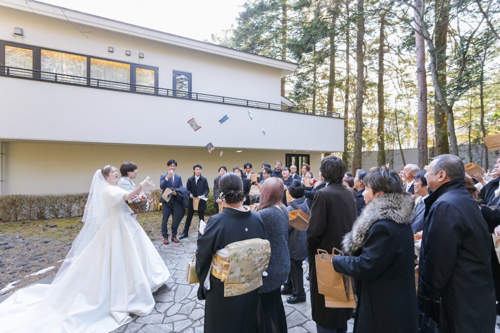 挙式後のアフターセレモニーでは、おふたりからゲストの皆様へお菓子まきのプレゼント。高い場所から次々と投げられるお菓子に、ゲストの皆様も思わず手を伸ばしながら大盛り上がり。お子様から大人まで楽しめる演出に、会場は笑顔と歓声に包まれました。おふたりが大切にされている「笑いの絶えない結婚式」というテーマ通り、ゲスト全員が一緒に楽しめる、賑やかで心温まる時間となりました。