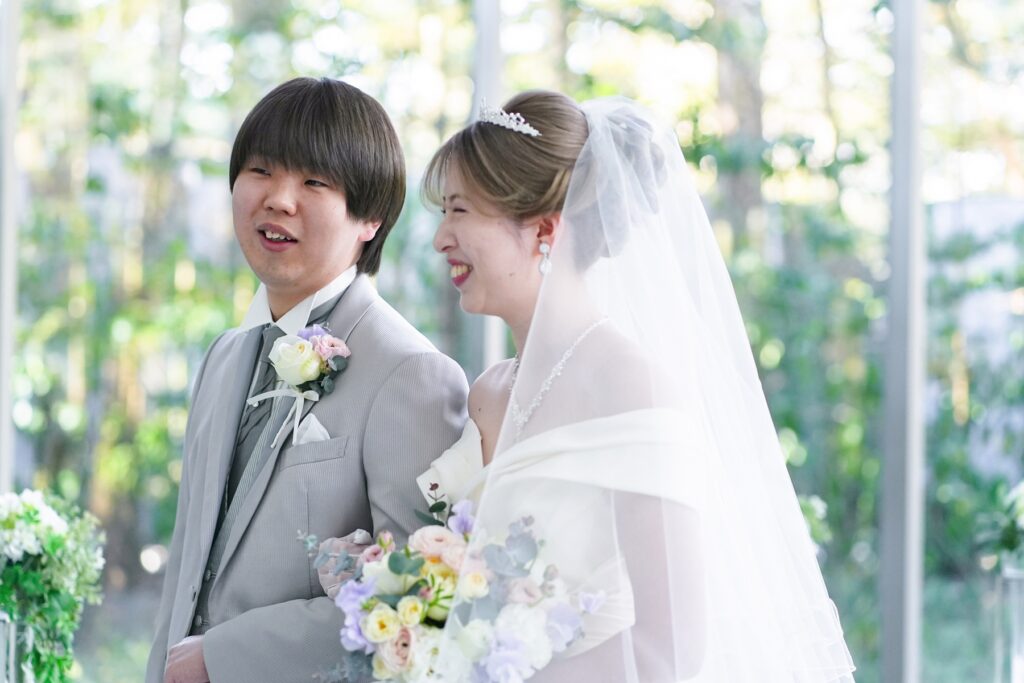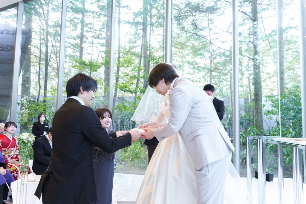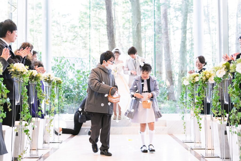 ゲストの皆様に結婚の証人となっていただく人前式では、おふたりらしい温かな演出がたくさん詰め込まれました。挙式前にはゲストへ向けたスイッチングレターをご用意し、これまでの感謝の気持ちをお手紙でお届け。さらに指輪の交換では、どなたがリングを運ぶか分からないサプライズリングボックスを実施し、会場は笑顔と驚きに包まれます。退場時にはフラワーガール&ボーイが登場し、祝福に包まれながら和やかな挙式となりました。