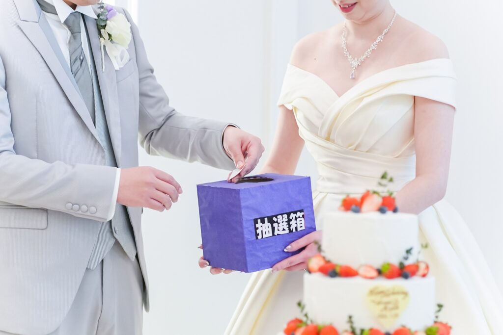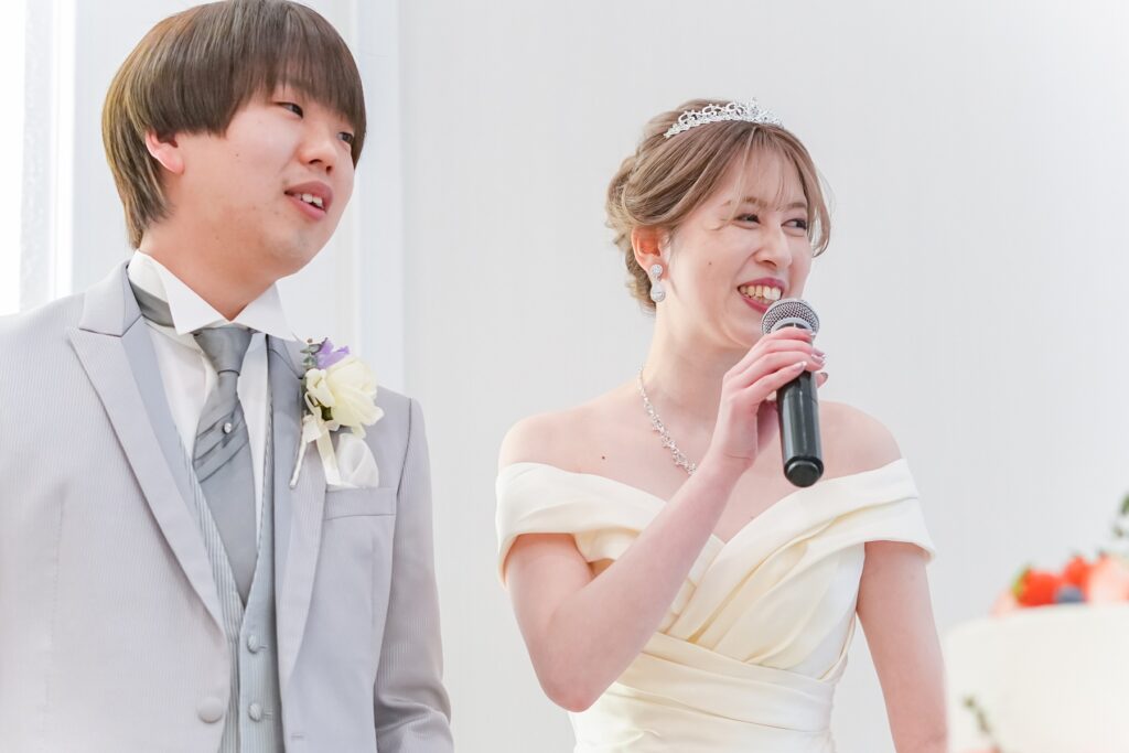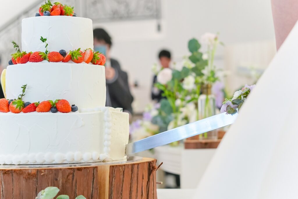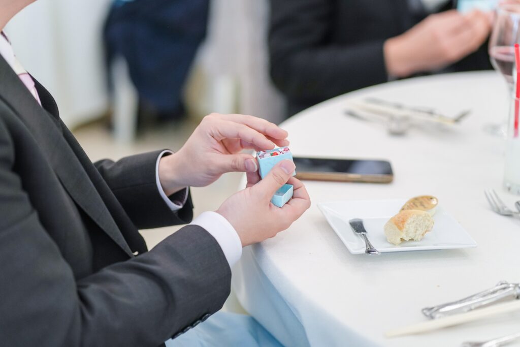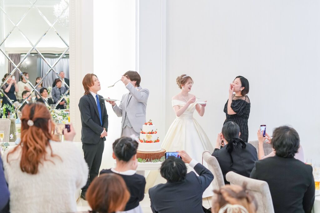 披露宴では、おふたりの幸せを分かち合うケーキセレモニーを実施。まずは定番のファーストバイトで仲睦まじい姿を披露し、会場からは大きな拍手が送られます。続いて感謝の気持ちを込めたサンクスバイト、そしてさらにサプライズバイトも。挙式で行ったリングボックスの数字をもとに選ばれたゲストが前へ呼ばれ、思いがけないサプライズに会場は大盛り上がり。笑顔と笑い声に包まれる、楽しいひとときとなりました。