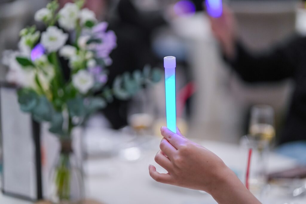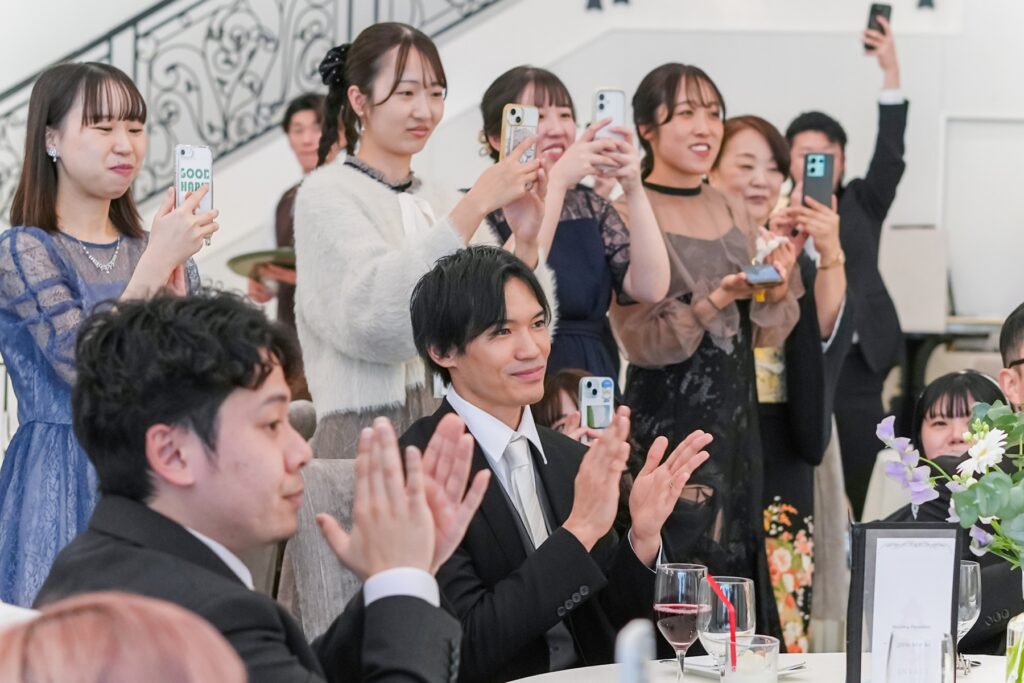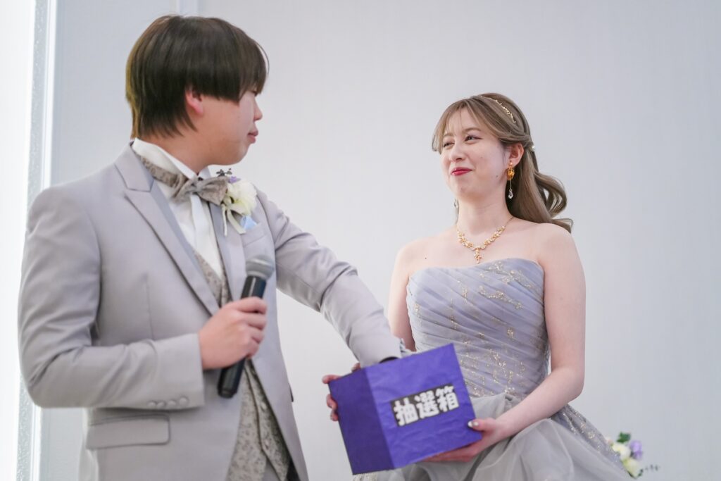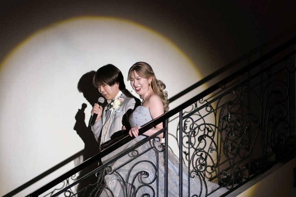 お色直し後の再入場では、ゲスト参加型のドレス色当てクイズを開催。新婦様のカラードレスの色を予想しながら入場を待つ時間も、会場全体がわくわくした空気に包まれます。そして階段からおふたりが登場すると、予想が当たった方も外れた方も思わず歓声が。ゲストの皆様が一緒に楽しめる演出で、披露宴の盛り上がりはさらに最高潮に。会場は笑顔と拍手に包まれました。