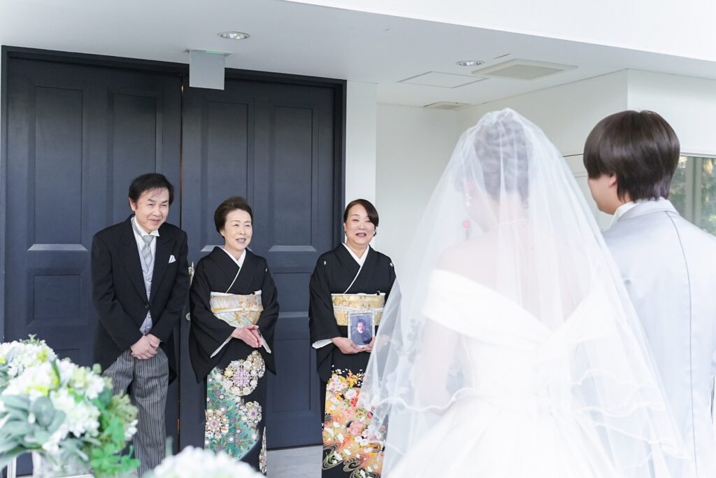 お支度を整えたおふたりが、まずチャペルで行ったのはご家族とのファミリーミート。これまで大切に育ててくれた親御様へ、結婚式という特別な一日の始まりに感謝の気持ちを伝えます。扉が開いた瞬間、晴れ姿を見た親御様の表情は驚きと喜びに包まれ、思わず笑顔と涙がこぼれる温かなひとときに。これまでの思い出を振り返りながら交わした言葉やハグは、これから始まる一日をより特別なものにしてくれました。