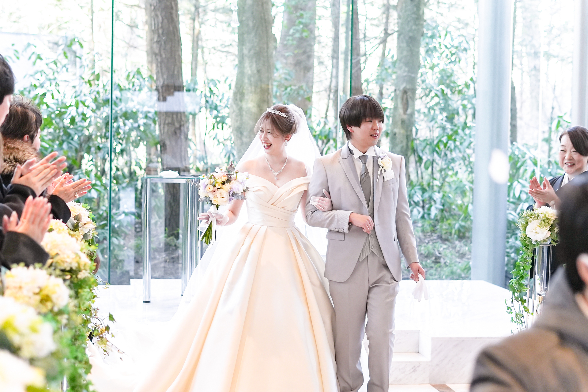 ゲストの皆様に結婚の証人となっていただく人前式では、おふたりらしい温かな演出がたくさん詰め込まれました。挙式前にはゲストへ向けたスイッチングレターをご用意し、これまでの感謝の気持ちをお手紙でお届け。さらに指輪の交換では、どなたがリングを運ぶか分からないサプライズリングボックスを実施し、会場は笑顔と驚きに包まれます。退場時にはフラワーガール&ボーイが登場し、祝福に包まれながら和やかな挙式となりました。