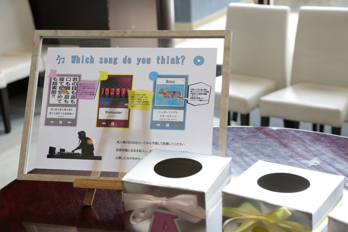 披露宴を行ううえでBGMは必要不可欠なものですよね。BGMがあることで盛り上がる場面も感動する場面も作ることができます。お二人が好きな曲や思い出の曲、流行りの曲を使って披露宴を盛り上げましょう!