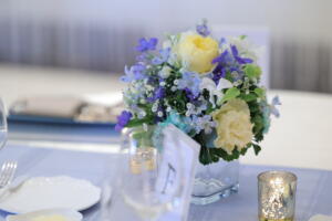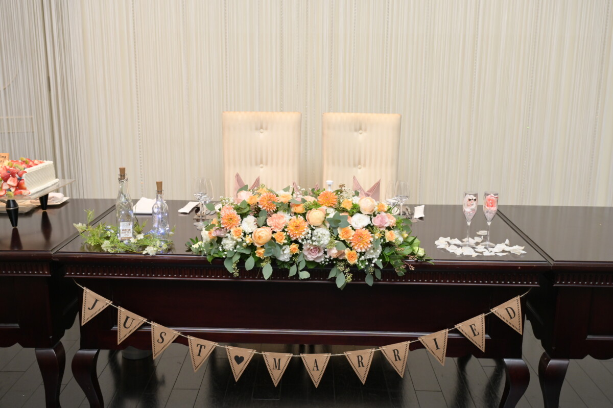 テーブルの上にディスプレイされる装花は、ワンポイントカラーのキラーアイテム。装花で季節感を表現するのも印象的です。