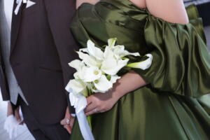 ドレスの色が映えるように全体のカラーを設計する。同系色でまとめるのも、あえて反対色を使うのも効果的。