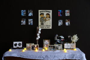 定番のウェルカムボードは、写真だけでなくイラストを取り入れるのもおすすめです。ウェルカムボードをメインに、シンプルにスペースを飾っても素敵に!