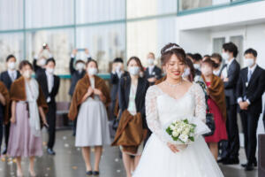 行う際は、ブーケを投げる為のスペースが必要になってくる為ガーデンや、天井の高い会場で行われることが一般的です。正統派で結婚式らしい雰囲気を楽しめる一方で花嫁が持つ本番用のブーケはスポンジやワイヤーが入っていて少し重いことも。安全にトスできるように、投げやすいサイズの「トスブーケ」を用意するのもおすすめです。