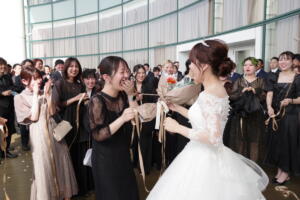 最近では「ブーケトス」の代わりに「ブーケプルズ」という演出を取り入れる花嫁も増えています。