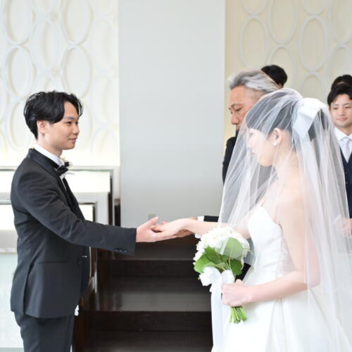 - 挙式ではこれまで大切に育ててくれたご新婦様のお父様お母様からご新郎様へバトンタッチセレモニーを。歩んできた時間とこれから始まる未来をつなぐ瞬間は言葉がなくとも深い愛情が伝わる感動的なシーンとなりました。静かに見守るゲストのまなざしもあたたかく、チャペル全体が優しい空気に包まれました。