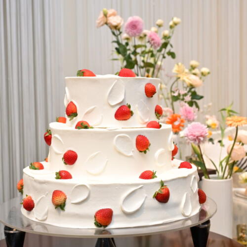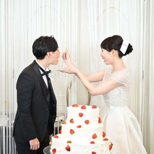 - 披露宴でのウェディングケーキセレモニーは大好きないちごをいっぱいあしらったおふたりオリジナルのウェディングケーキ!おふたりからゲストの方へ感謝の気持ちを込めたサンクスバイトも実施。サプライズで名前を呼ばれたゲストの方の笑顔と会場に広がる笑顔で、感謝の気持ちがしっかりと伝わるひとときとなりました。おふたりとゲストの方との距離の近さが感じられる心和む演出です。