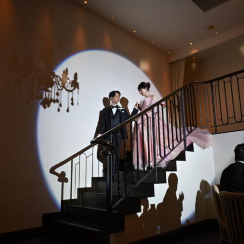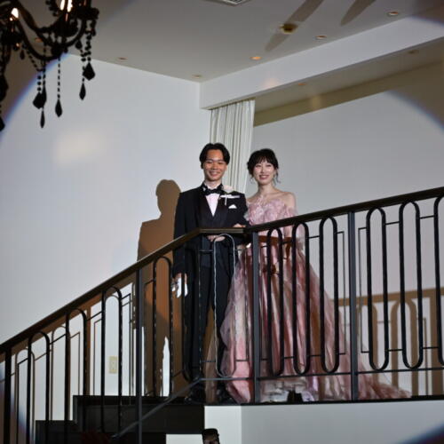- お色直し後はエリア内で唯一叶う階段からの入場。ゆっくりと姿を現すおふたりにゲストの方の視線が一斉に集まり、会場には大きな拍手が響きました。特別感あふれる演出がおふたりの再登場をより印象的に彩り忘れられないワンシーンとなりました。