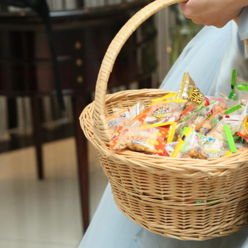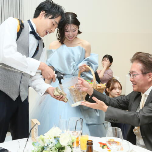 - 披露宴では新郎様がビールサーバーを背負って、ご新婦様はおつまみをもってゲストの皆様のテーブルをラウンド。グラスにビールを注ぎながら直接ゲストと会話を交わす時間は会場全体が一体となる和やかなひとときに。ゲストの皆様から「おめでとう!」の声や笑顔が飛び交い、距離の近いアットホームなパーティーならではのあたたかな時間となりました。