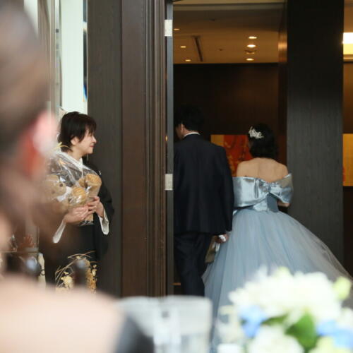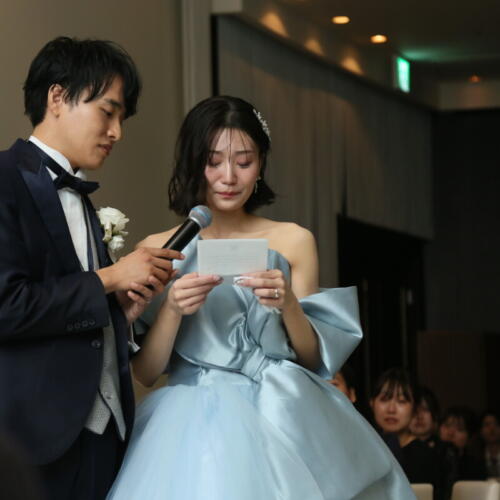 - 披露宴の結びにはご新婦様からご家族へ向けた手紙の時間。これまでの感謝の気持ちや思い出に、そしてこれからの決意がつづられた言葉に会場は静かな感動に包まれました。親御様の表情や涙にゲストも思わず胸が熱くなる瞬間。たくさんの祝福に包まれながら、おふたりの新しい一歩があたたかく見守られました。