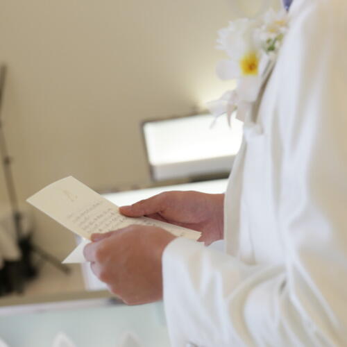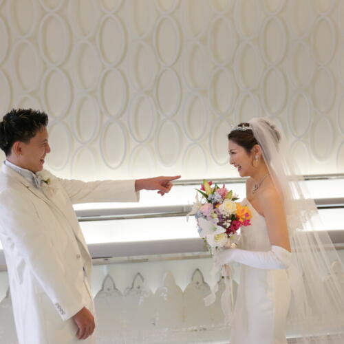 - 一日の始まりはおふたりだけの特別なファーストミートから。ご対面の前にご新婦様からご新郎様へのサプライズのメッセージが贈られました。突然の想いのこもったお手紙に思わず涙がこぼれるご新郎様。そしていよいよ振り向いて顔を合わせた瞬間、涙を流しながらも思わず笑い合うおふたり。これまでの想いとこれから始まる新し人生を確かめ合うあたたかく心に残る時間となりました。