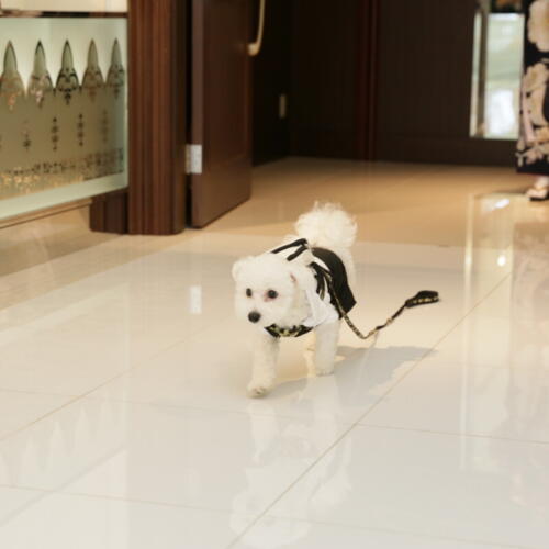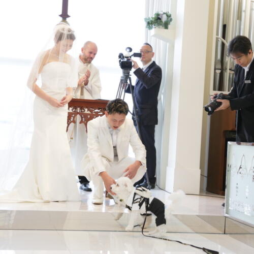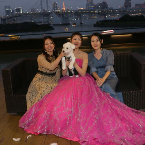 - 挙式では大切な家族の一員であるおふたりの愛犬がリングドッグとして登場。一生懸命に指輪を届ける姿に会場からは自然と温かな拍手と笑顔が広がります。更に披露宴の入場ではおふたりと愛犬がお台場のロケーション望めるテラスから揃って入場。ふたりと一匹で歩くその姿はとても微笑ましくゲストからも感背うが上がりました。大切な家族と過ごすおふたりらしいあたたかなウェディングとなりました。