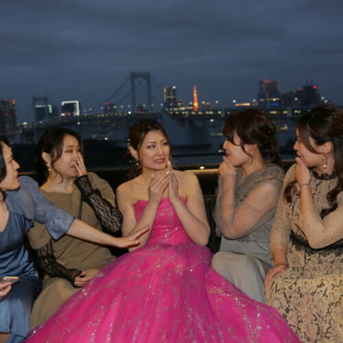 - パーティー後半にはきらめく夜景をバックにフォトタイムの時間を。昼間とはまた違うロマンチックな雰囲気の中、おふたりの笑顔がより一層輝きます。夜景を背景にした撮影は、天候に左右されにくいのも魅力の一つ。美しい光に包まれながら撮影された写真一枚一枚はこの日の幸せな記憶を残す特別な瞬間となりました。
