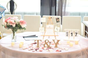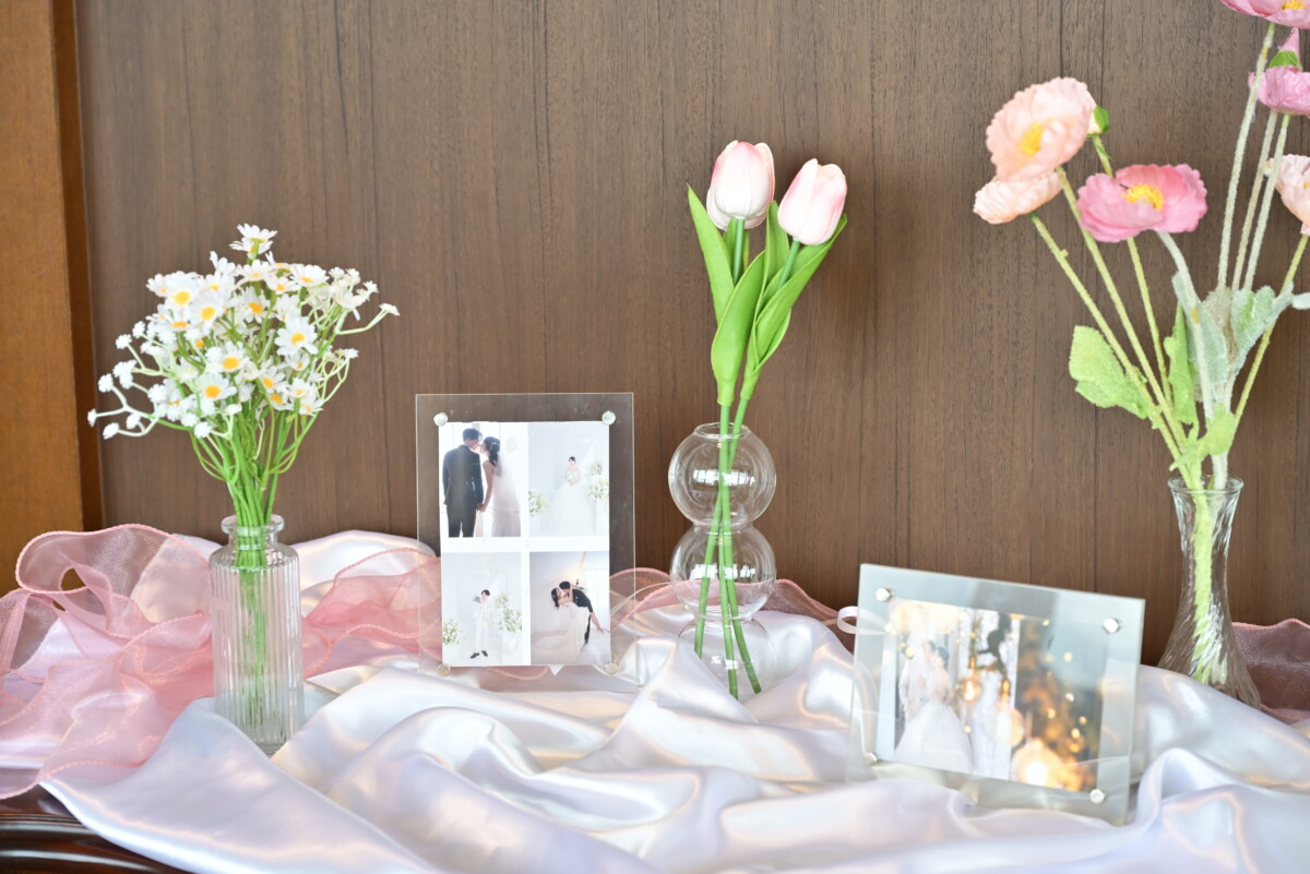 前撮り写真や思い出のアイテム、テーマカラーのお花を添えるだけでも