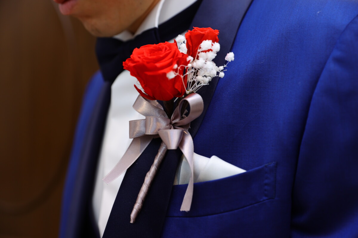 挿す場所もスーツのボタンホールから、ピンで留める物やポケットに挿すものだったりとスタイルも様々になりデザインの自由度が広がったことで、新郎の個性をより素敵に表現できるようになりました。