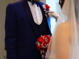 親御様が新郎様の胸元にブートニアをつけるセレモニーがあります。これは、息子の成長を見守ってきた親御様が、いよいよ巣立ちの時を迎える瞬間を象徴する、心温まる場面です。