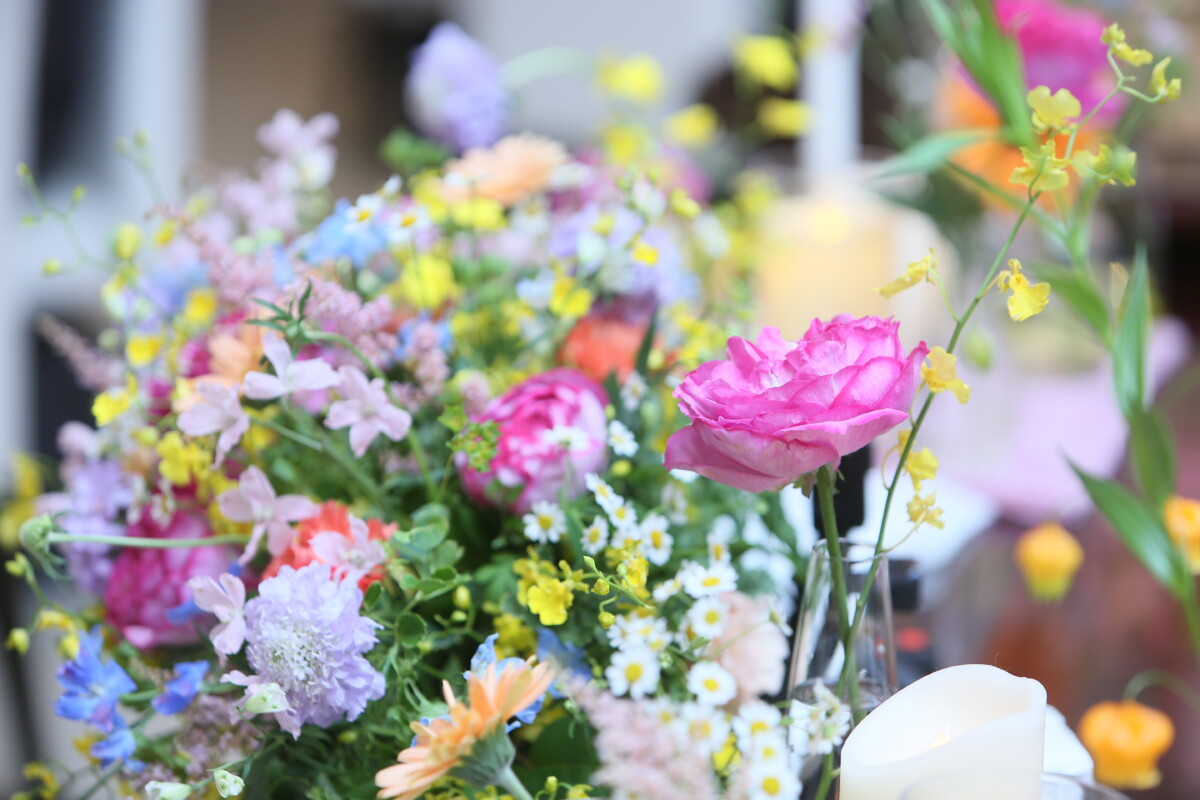 ゲストの席を彩る装花で、最も目に入るおもてなしの花です。中央に大きく飾るのも、小さなアレンジを人数分用意するのも素敵です。