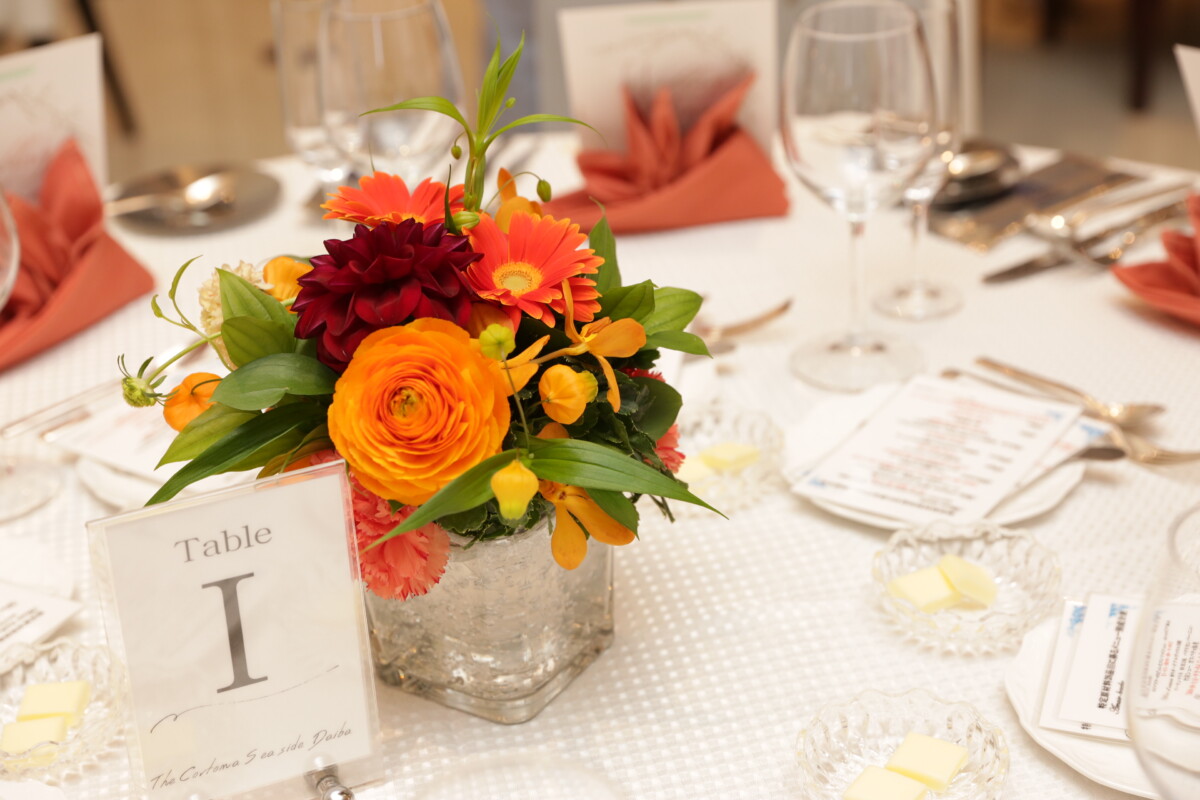 ゲストが座るテーブルの中央を彩るゲストテーブル装花。