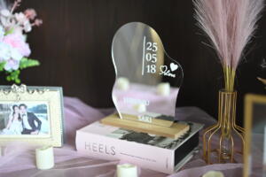 今年の流行でもあるウェルカムミラー。ただミラーを置くだけでなく、日付や名前を入れてオリジナルのデザインにするのも素敵です。ウェルカムアイテムとしての活躍をしつつ、ミラー越しに写真撮影できるフォトスポットにもなります。