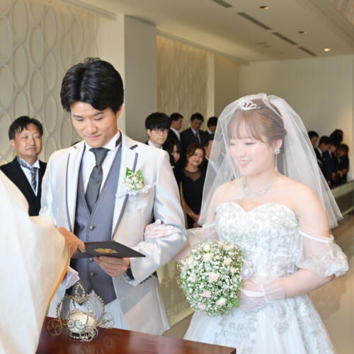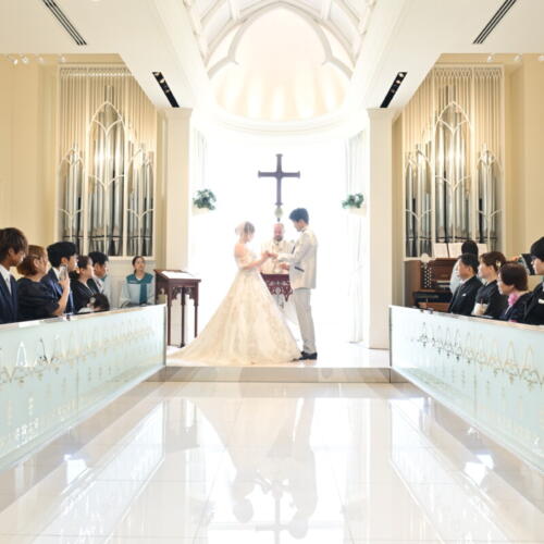- 挙式は海を望む対面式チャペルにて厳かに執り行われたキリスト教式。祭壇の向こうに広がる景色とゲストの皆様のあたたかなまなざしに見守られながら交わす誓いの言葉は、より一層心に響くひとときとなりました。向かい合うゲストの表情を感じられる対面式だからこそおふたりの想いが真っ直ぐに伝わる感動的なセレモニーとなりました。