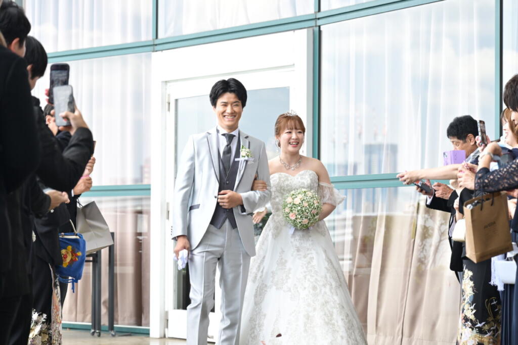 - 挙式後は開放感あふれるテラスへ。お台場ならではのロケーションが広がる中、ゲストの皆様からの祝福のフラワーシャワーに包まれながら歩くおふたり。青空と祝福の花びら、そして笑顔が重なり合うシーンは、思わずシャッターを切りたくなるような美しいワンシーンとなりました。