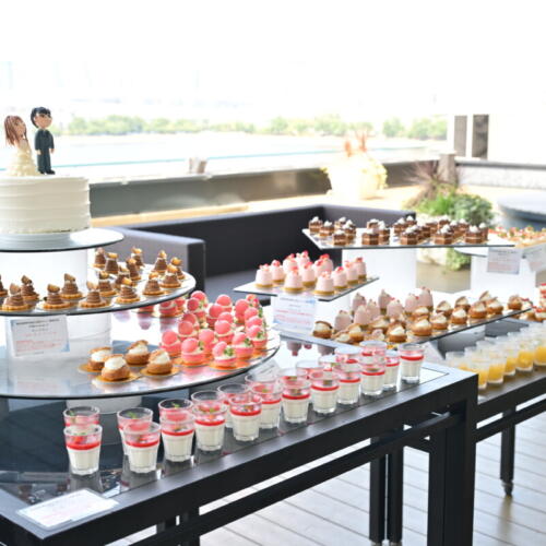 - ドレスチェンジ後はテラスでの写真撮影を。あたたかな自然光に包まれながら撮影された一枚一枚はロケーションの魅力とおふたりの幸せが詰まった特別な思い出に。そのままテラスからの入場で披露宴がスタートし、ゲストの皆様の期待感も一気に高まります。パーティー中はテラスにてデザートビュッフェを振る舞い自由に楽しむ歓談中心の時間に。ロケーションを最大限に活かした演出がおふたりらしいをパーティーを演出しました。