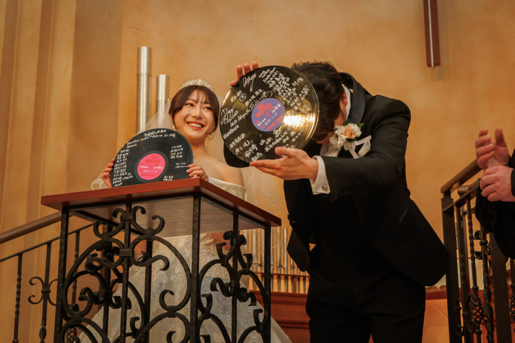 音楽が大好きなおふたりらしく、結婚証明書はレコードをモチーフにしたオリジナルデザイン。ゲストひとりひとりから署名をもらい、会場はあたたかな祝福に包まれました。皆様の想いが刻まれたレコード型証明書は、世界に1つだけの1枚となりました。音楽のように心に残る、ふたりらしい門出を象徴する感動的なシーンとなりました。