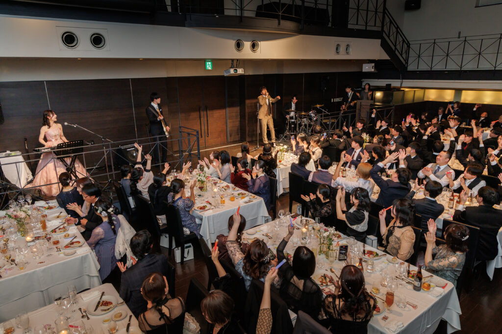 ボーカルが新郎、キーボードが新婦。学生時代の友人と一緒にバンド演奏を披露しました。音が鳴り響いた瞬間、会場はライブさながらの盛り上がりに包まれました。手拍子や歓声が広がり、ペンライトを振りながら、ゲストも一体となって楽しむ特別なひとときに。ふたりの想いが音にのって伝わる、熱狂的なシーンとなりました。